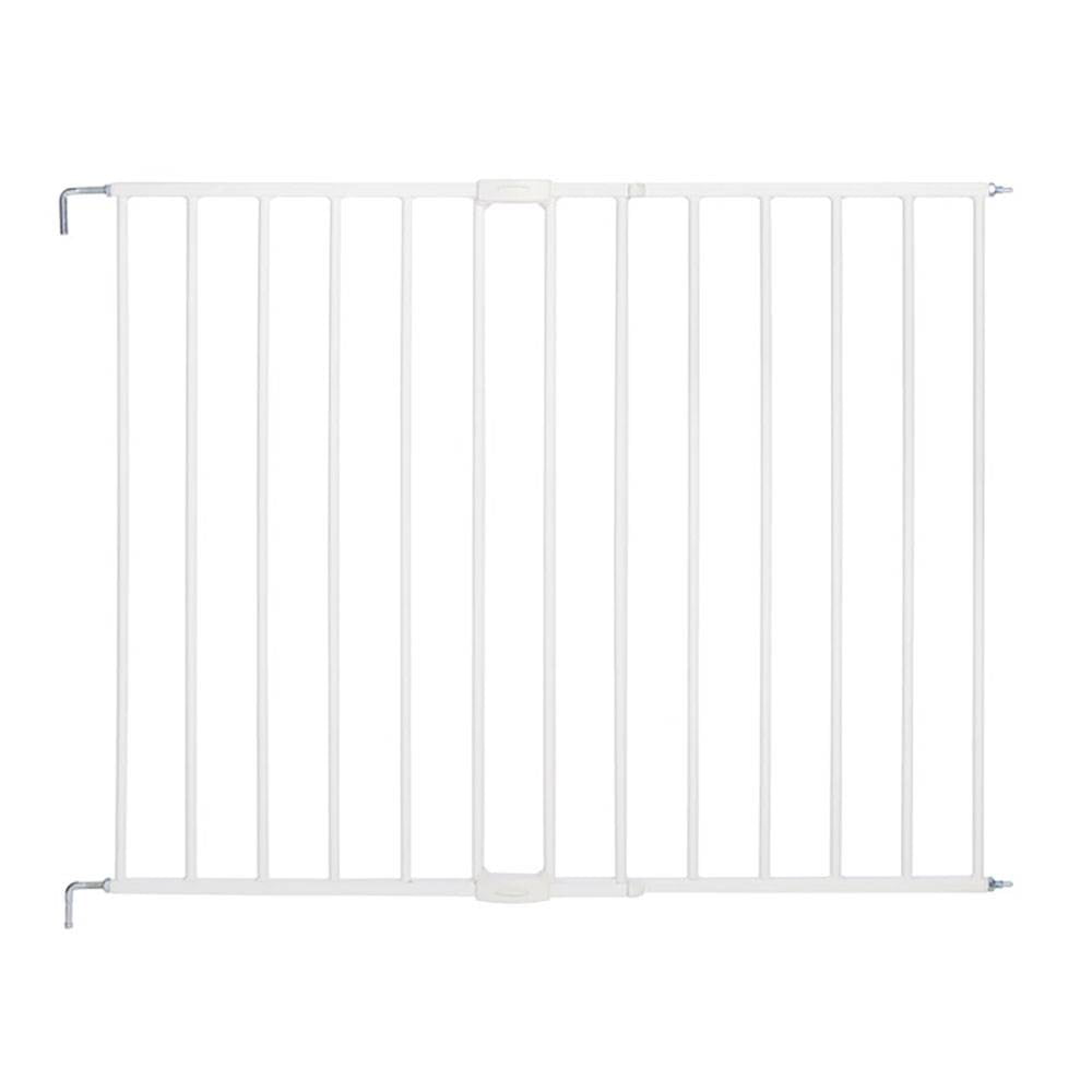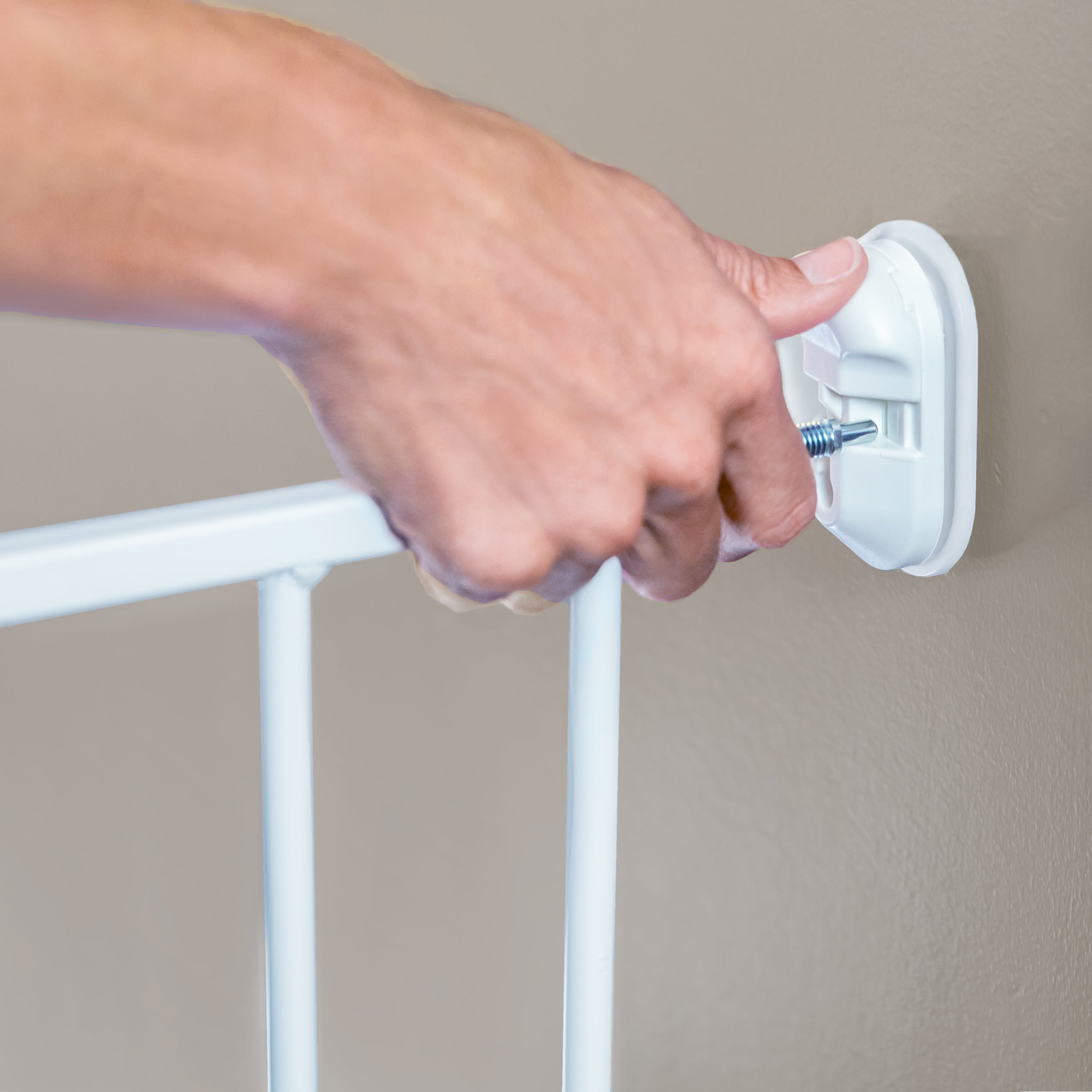 24.5″-40.55″ baby safety gate Intended for children ages 6-24 months Stairway and walkway gate designed to fit in doorways, hallways or top of stairs Features sturdy metal construction with a secure safety latch design and the option for one-handed operation Designed without a threshold to step over and a gate that does not swing out over the stairs Adjustable gate conveniently and easily removes when not in use White color stylishly blends into home interior design 30 inches tall and expands 24.5-40.55 inches wide JPMA Certified and ASTM Certified