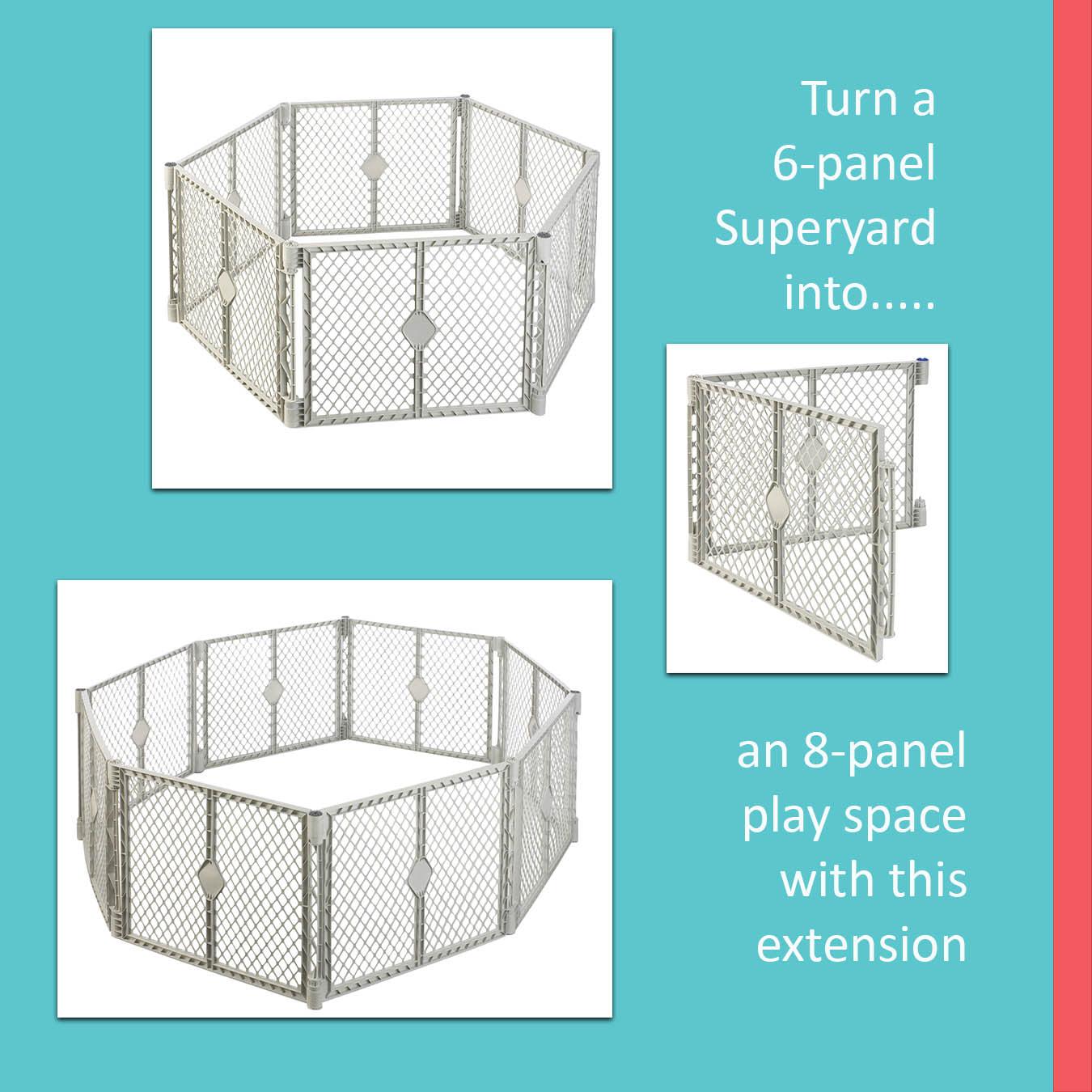 The Toddleroo by North States Superyard Classic Play Yard creates a safe play area for your little one. This 6-panel freestanding play yard is designed with pre-connected interlocking panels for easy setup: simply pull the panels out of the box, unfold them, and connect them. It even folds up like an accordion, so you can bring the fun with you anywhere, inside or outside. The Toddleroo Superyard Classic can be used inside on a variety of floor surfaces, encloses up to 18.5 square feet, and stands 26 inches tall. It includes a convenient carry handle which makes this lightweight yard easy to bring the fun with you. Plus, the light gray color will stylishly blend into your home décor. To increase the play area, a Two-Panel Extension is available separately. As your little one becomes more adventurous, you’ll love the ease of setting up this play yard anytime, anywhere.