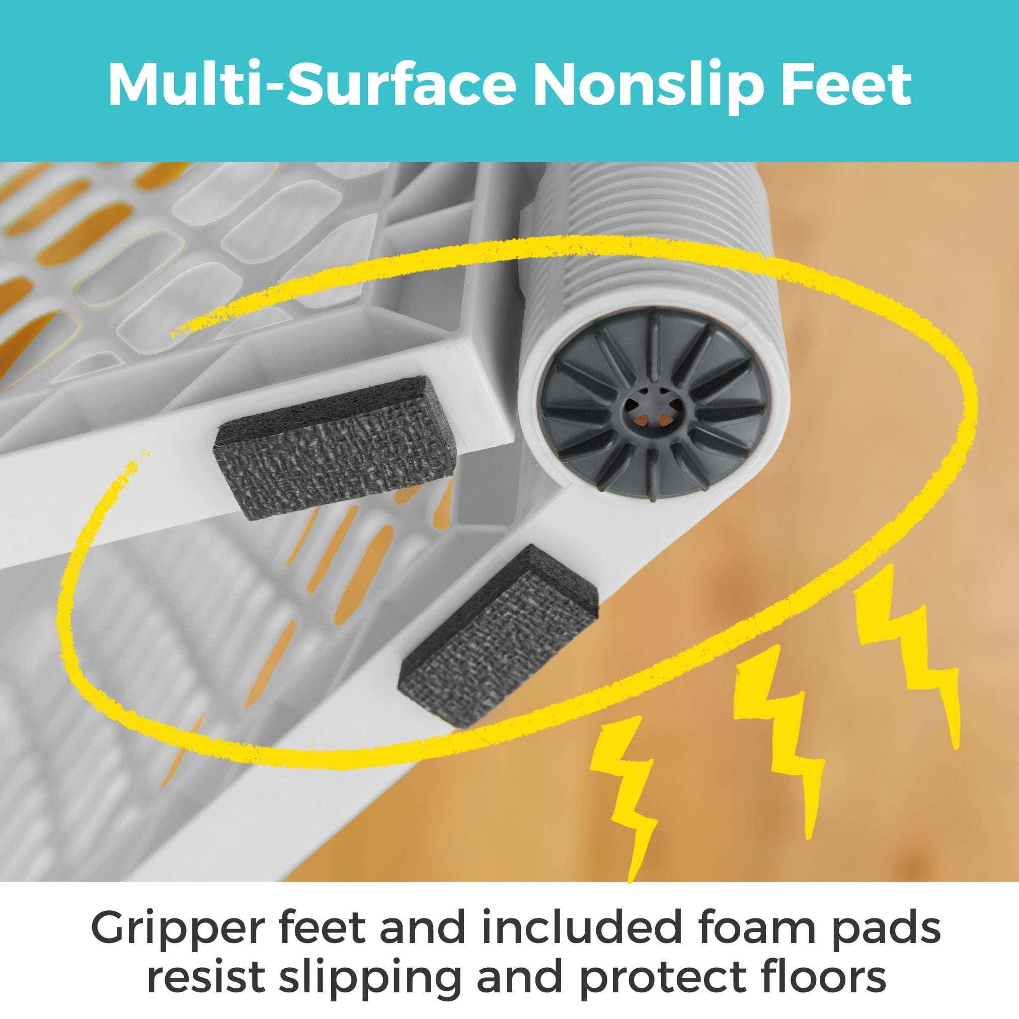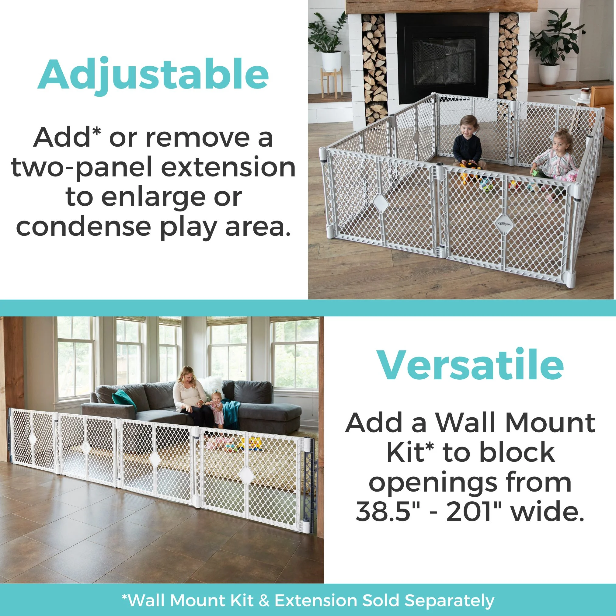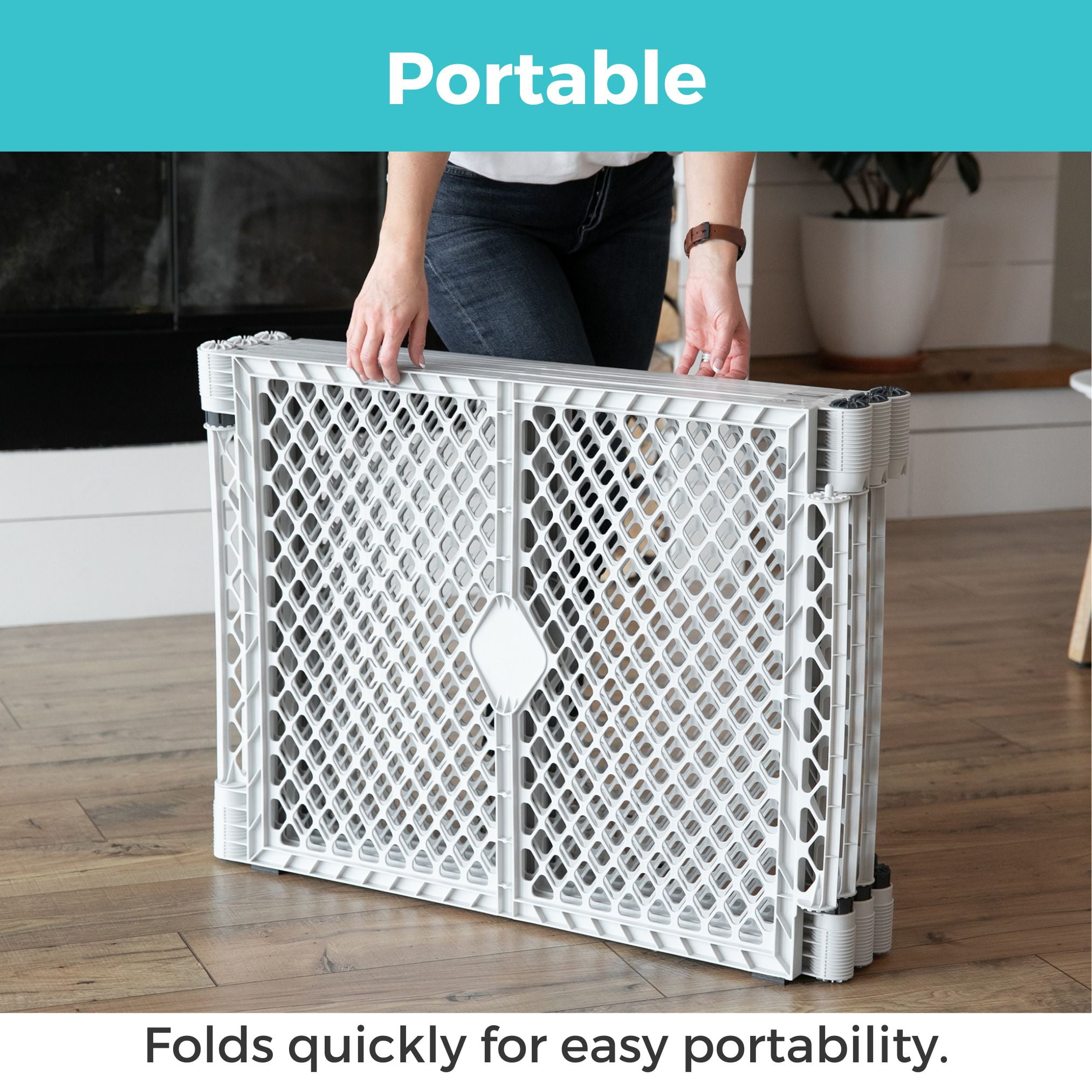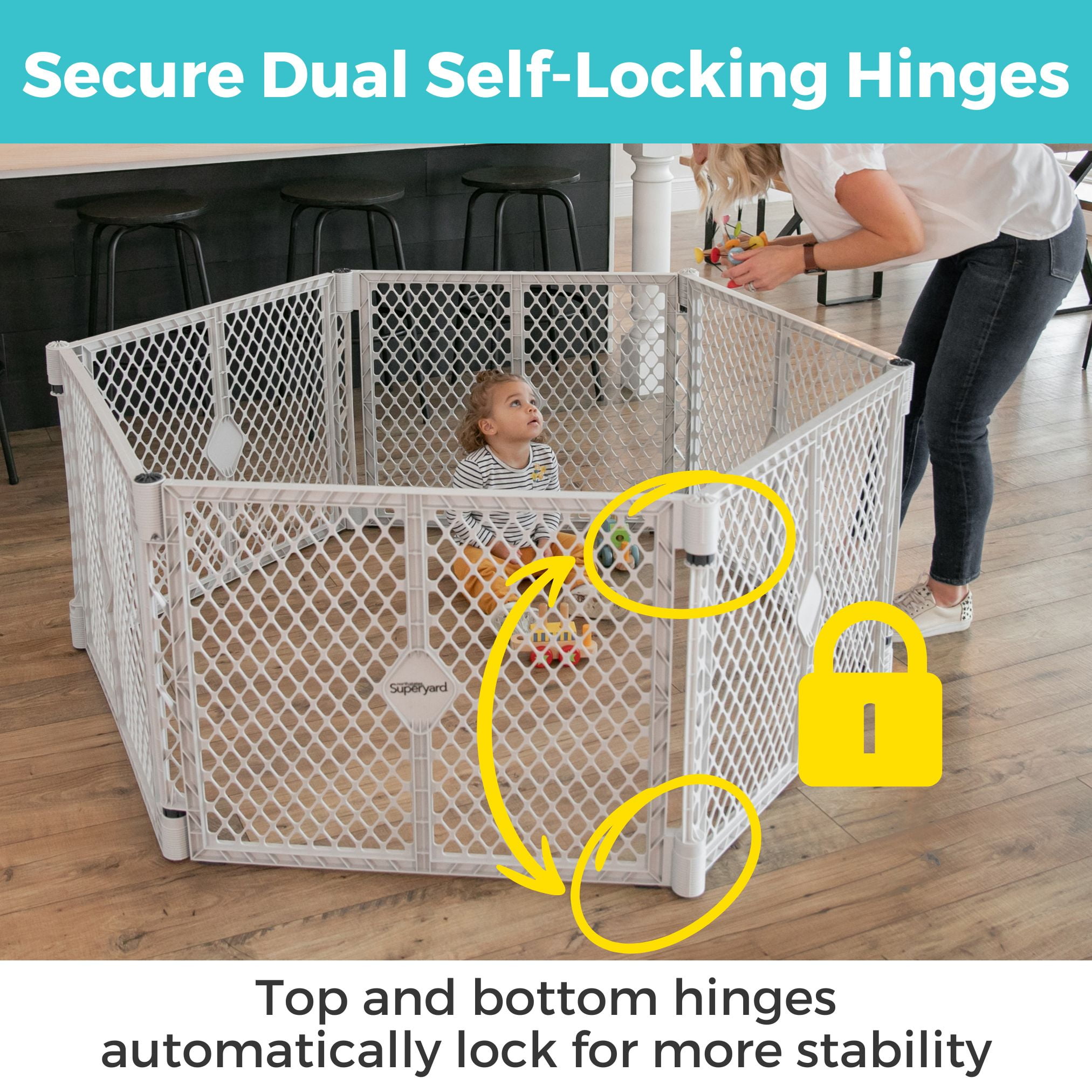 The Toddleroo by North States Superyard Explorer Play Yard creates a safe play area for your little explorer. This 6-panel freestanding baby play pen is designed with pre-connected interlocking panels for easy setup: simply pull the panels out of the box, unfold them, and connect them. It even folds up like an accordion, so you can bring the fun with you anywhere, inside or outside. The Toddleroo Superyard Explorer can be used inside on a variety of floor surfaces, encloses up to 18.5 square feet, and stands 26 inches tall. Plus, the light gray color will stylishly blend into your home décor. As your little one becomes more adventurous, you’ll love the ease of setting up this play yard anytime, anywhere.