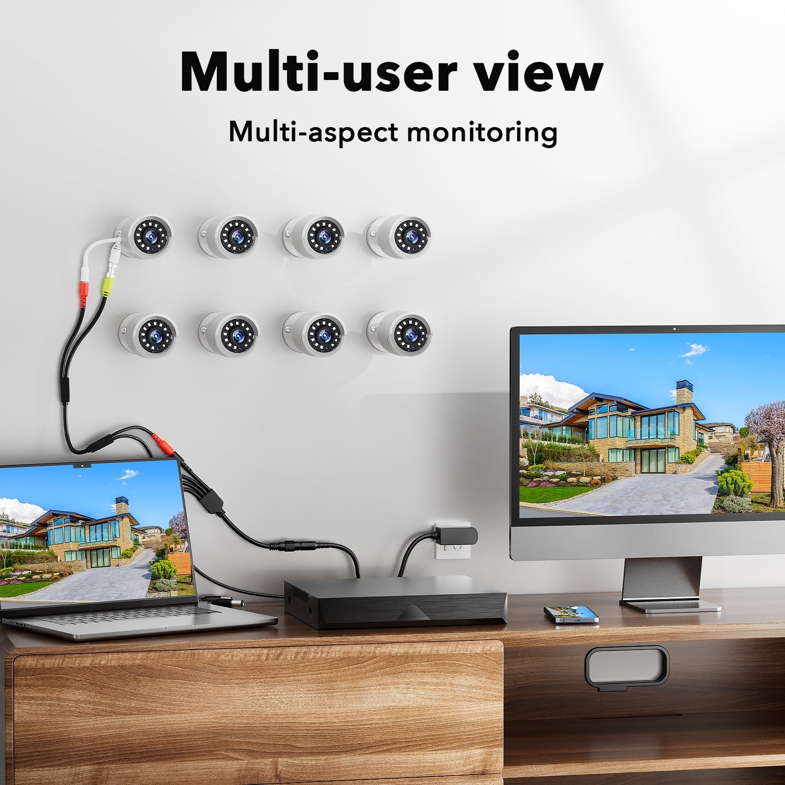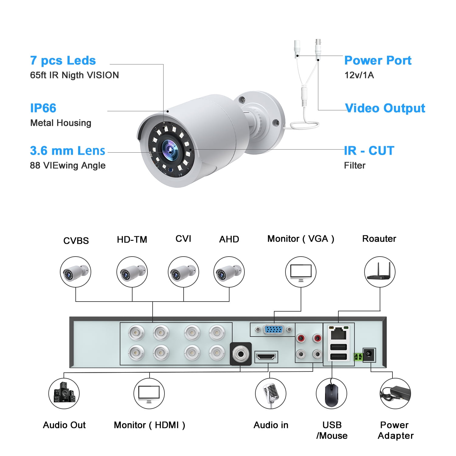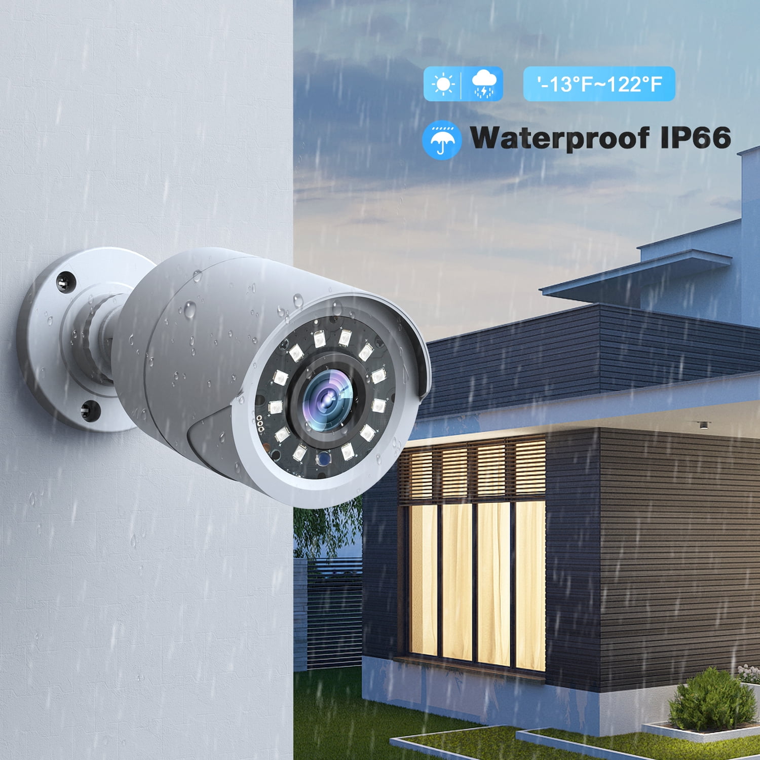 💎【1080P HD Resolution】 With 8pcs1080P HD bullet night vision cameras, it ensures clear and detailed footage day and night for enhanced security monitoring both indoors and outdoors. 💎【Day and night vision】 This camera equipped with 12 infrared lights and photoresistors for clear night vision even in low light conditions. 💎【Real-time Views】 Experience Stable the real-time views with the SC35 8CH wired security camera system, ensuring you never miss a moment of surveillance. 💎【3TB hard drive & Cloud Storage】 Store your recordings with ease using the 3TB hard drive and Cloud Storage, providing round-the-clock stored. 💎【24/7 monitoring and playback】 Ensuring ample storage space for 24/7 recording with the adoption of H.265+ video compression technology. 💎【App push & Remote Access】 Enjoy app push notifications & Remote Access and multi-user sharing for seamless monitoring and interaction, making it ideal for homeowners, small business owners. 💎【IP66 waterproof】 IP66 waterproof rating makes it suitable for outdoor use, ensuring durability in various weather conditions. 📜Specifications 🔖High Definition :1920*1080P Full HD 🔖Audio: Not supported 🔖Night Mode: Infrared night vision 🔖Visible Distance at Night: 65-100ft 🔖Sensor Detection: Support Motion Detection 🔖Waterproof: IP66 🔖Cloud storage: Supported 🔖Channel: Supports 8 cameras 🔖Hard Drive: 3TB (preinstalled in DVR already) 🔖Length of cable: 20M/65FT 🔖Remote Access: iOS/Android Phone, Windows, Mac. 🔖Working Temperature:-13°F~122° F( -25° C ~50° C) 🔖Viewing Angle: 88° 📜Package Includes: 📦8 x Waterproof AHD Bullet Cameras 📦1 x 8 Channel DVR(3TB Hard Drive Pre-installed) 📦8 x 65FT BNC Video/Power Cable 📦2 x DC 12V/2A Power Adapter 📦1 x USB Mouse 📦1 x Ethernet Cable 📦1 x Power Cable Splitter 📦1 x Quick Guide