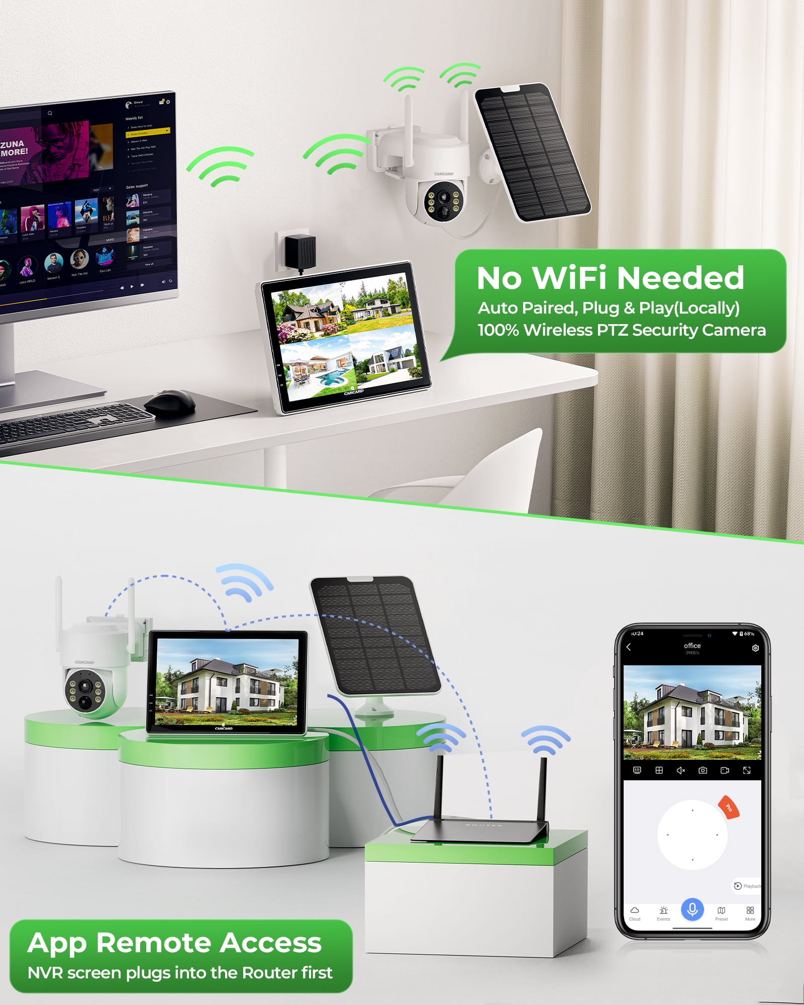 Introducing the SC43 10CH Solar Security Camera System with 10.1″ 10CH NVR Monitor, Say goodbye to complicated installations and enjoy hassle-free security. With its 2K/4MP 355° Pan and 90° Tilt Dome camera, you can now capture every detail with utmost precision. The solar panel and battery power ensure continuous operation without the need for frequent recharging or wiring. Featuring two-way audio, you can communicate in real-time with anyone near the camera, making it perfect for monitoring entrances, front desks, or rental properties.The private 10CH ensures a secure connection to the camera, without compromising the speed of your WiFi network. The 10.1″ 10CH NVR Monitor supports video playback without the need for an additional screen. Equipped with IP66 waterproof rating, infrared night vision and a PIR motion sensor, the SC43 ensures home surveillance. Rest assured knowing that any movement or activity will be detected and recorded.