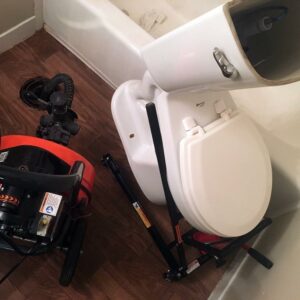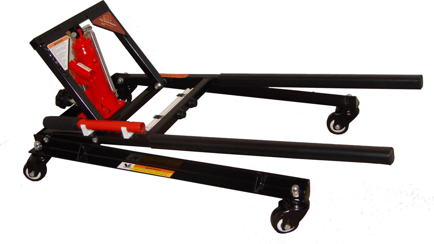 The Toilet Jack makes lifting, moving and installing all types of toilets a snap. It eliminates heavy lifting which eliminates the risk of injury. Not only does it lift the toilet to allow repairs to the floor, cleaning the drain line or replacement of a wax ring, but the wheeled assembly allows you to easily move the toilet out of the way or even into another room. The Toilet Master Jack works on all commercial type toilets. The Toilet Master Jack reduces leaks or dripping because it tilts the toilet slightly forward, you don’t have to sponge out every drop of water! And because of the controlled lowering, lining up the flange bolts is now effortless with The Toilet Master Jack alignment tubes.