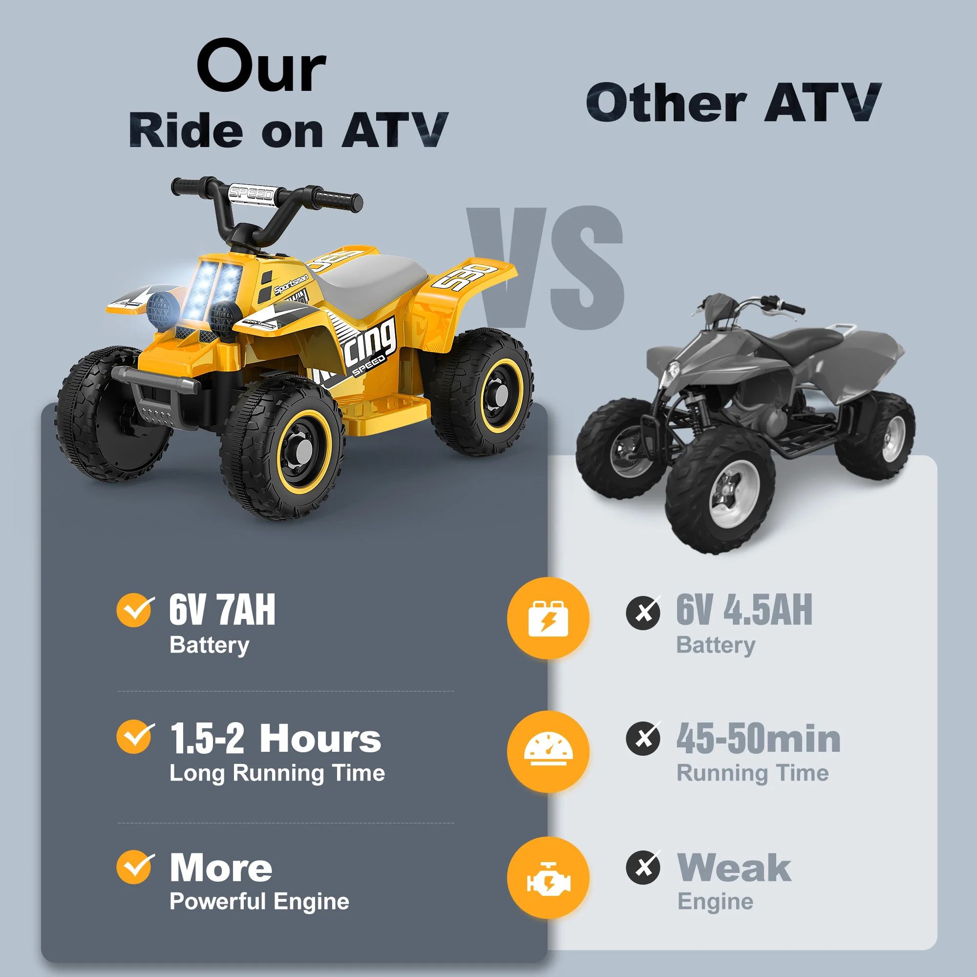 【Longer Playtime】💛Our ride on ATV is equipped with 6V 7Ah larger-capacity rechargeable battery, compared with most 6V 4.5Ah ride-ons, A full charge will last approx 80-120 min longer playtime, providing your child longer periods of continuous play. 【Enhanced Safety】💛This kids electric quad car has a low center of gravity and sturdy four-wheel structure for a safe and stable ride. The seat fits the curves of children’s bodies for comfort, while the footrests comfortably accommodate young children’s feet. 【Easy to Operate 】💛This toddler’s riding ATV is easy to operate. Simply press the forward button on the console and press the gas pedal, and the car accelerates at a constant and safe speed of 2 Mph, and release the pedal to decelerate and stop. which is really suitable for baby’s little fingers and hands. The car moves smooth, quiet and stable, and your little one can easily adapt in a few minutes and have fun in driving around. 【Multiple Features】💛This 4-wheeler ride on toy had has bright LED headlight and an in-built MP3 player which can play preset songs. And it also comes with Bluetooth that supports mobile connection to play your kid’s favorite songs or stories while riding, making it twice as fun. 【Perfect Gift for Kids】💛An ideal gift for children aged 18-36 months for their first race. Maximum weight up to 55 lbs. This 6V electric quad car is designed to be a real kids sized beach ATV, has handle with horn, brings driving fun while developing motor skills (under parental supervision). It is really a wonderful choice as a gift for toddler unisex. In addition, this electric toy car is ASTM F963 CPSIA certificated, harmless to children’s health. 【Superior Customer Service 】💛We provide exceptional customer support throughout your purchase experience and beyond. If you have any questions about our battery powered ride-on cars, please feel free to contact us. Our dedicated customer care team will respond with solutions within 24 hours. [SCS: [email protected]]