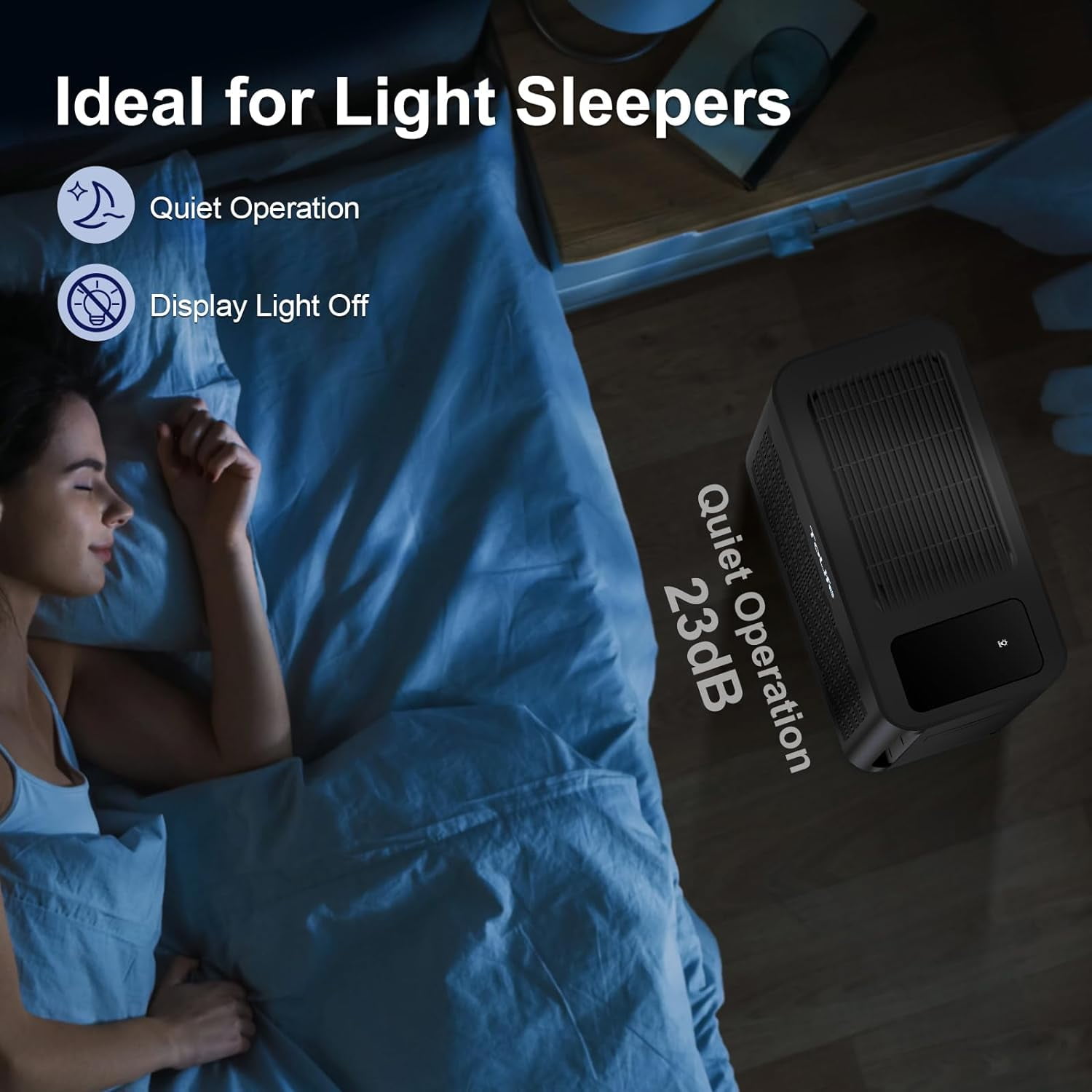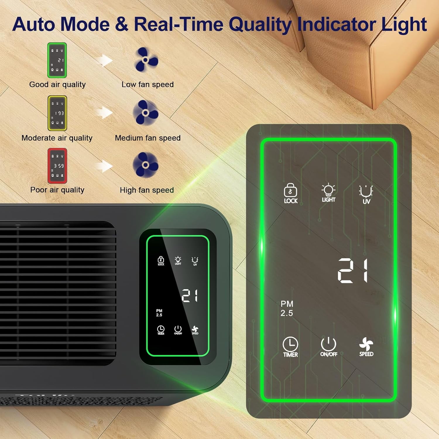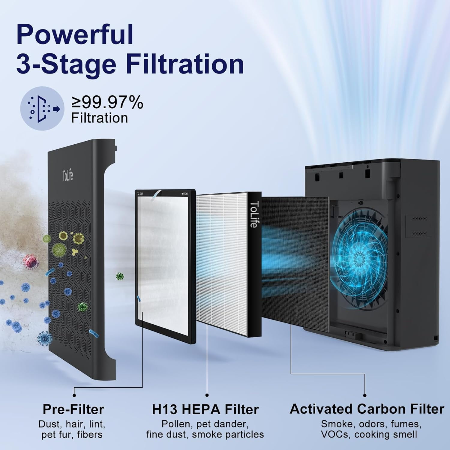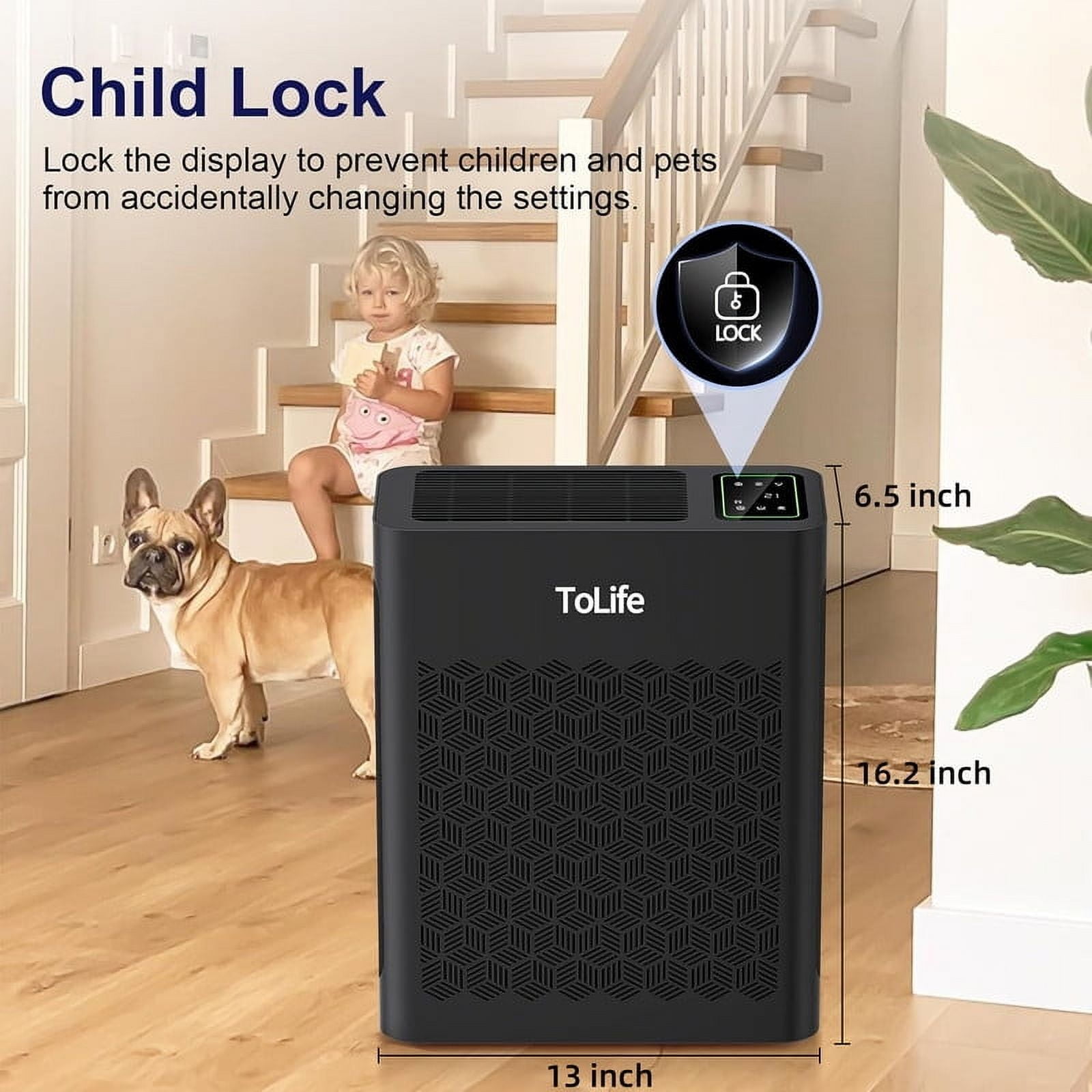 ToLife air purifier is preferred for its ability to enhance indoor air quality, promote well-being, eliminate odors, improve sleep, and operate efficiently and sustainably. Create a Healthy and Refreshing Sleep Environment for You! Features: Color: Black Item Weight: 8.44 pounds Floor Area: 1095 Square Feet Specification Met: CARB Certified 3-Stage Filtration: YES Filter Replacement Indicator: YES Air Quality Indicator: YES Timer Settings: 2/4/6/8 Hours Product Dimensions: 6.5″D x 12.99″W x 16.34″H