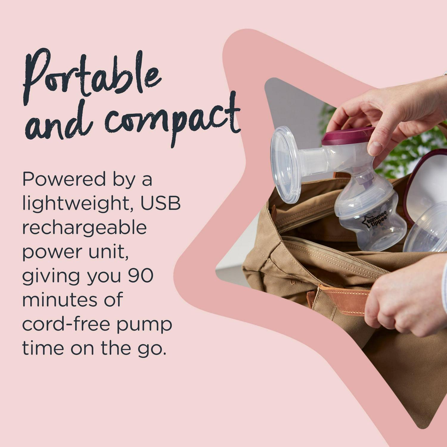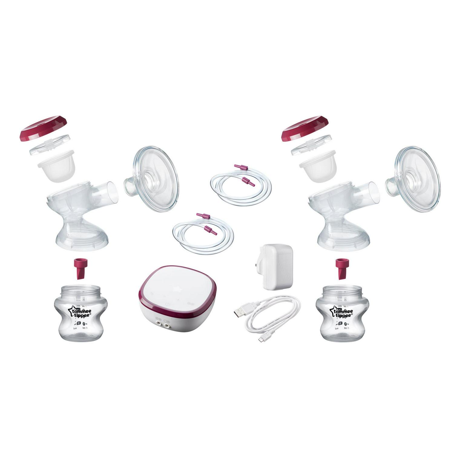 The Tommee Tippee Made for Me breastfeeding products is designed especially for you because you re one of a kind. This double electric breast pump is designed for the modern mom because it is small and discreet, truly portable, and mighty quiet. Simply charge it up, get comfortable, and find one of the customized massage and pump modes that feels right for you. Not every day will be the same, so being able to adjust the settings provides maximum comfort during your breastfeeding journey. Compatible with all Tommee Tippee Closer to Nature and Advanced Anti-Colic baby bottles. We want to support your breastfeeding journey by enabling you to feed your baby wherever and whenever you want. Helping you Parent On excludes glass In the box: Portable and rechargeable power unit, 2x breast pump handsets, 1x USB cord and plug adapter, 2x 5oz Closer to Nature baby bottles (w/ Slow Flow nipple), 2x milk storage lids.