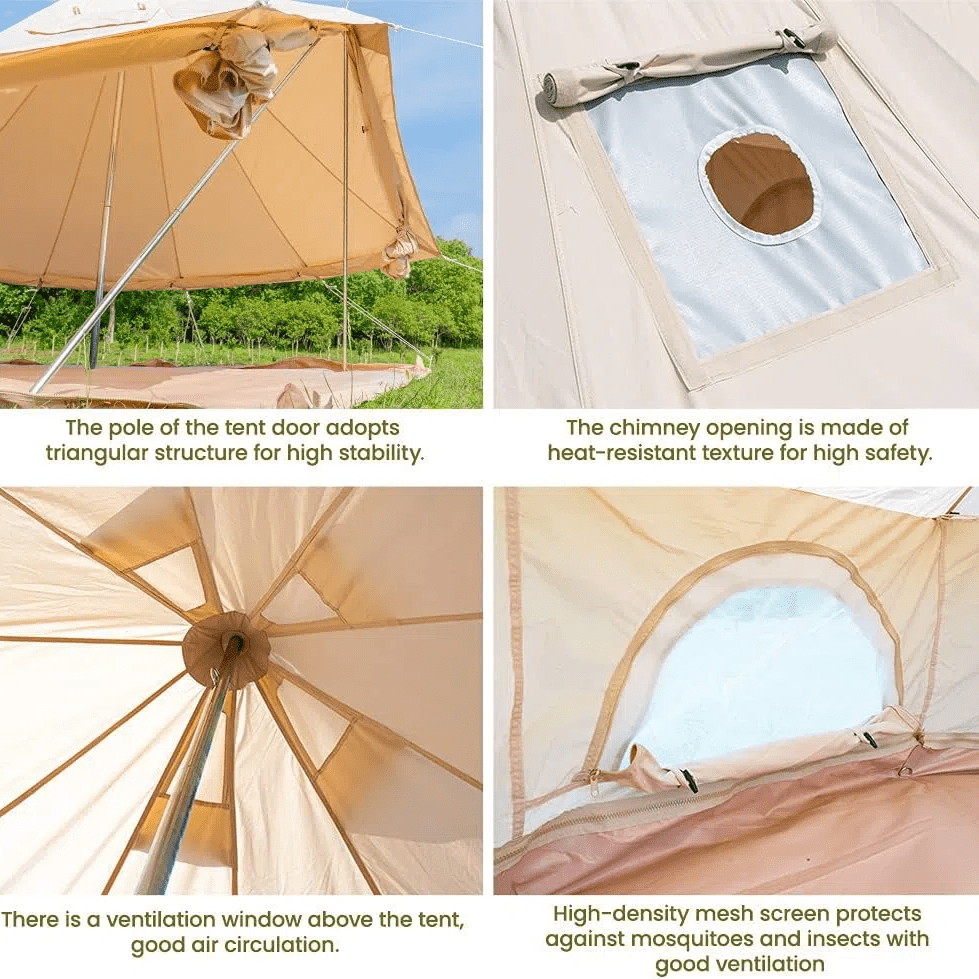 【Eco-friendly plating material】35% of 200GSM cotton, 65% of polyester. It has excellent wear resistance and tear resistance, heat resistance such as sparks, strong water and dirt resistance, good air permeability, so it is not easy to condense. Cool in summer and warm in winter. The floor panel is a special thick floor mat made of 540gsm PVC with 20000mm+ waterproof PU coating. It is snowproof, waterproof and windproof, allowing you to stay dry and comfortable. 【360 degree visibility】 The floor seats are removable, and when you roll up the walls, you get a 360-degree view and wind, You can enjoy the breeze in the summer sun. Admire the beautiful scenery and breathe fresh 【Safe ventilation】Mesh panels throughout the entrance as well as four windows and four roof vents allow for efficient internal air circulation. A 13 cm stove jack was installed on the roof. New fireproof fiberglass fabric ensures tent safety. The door stem adopts a triangular structure for improved stability and safety. All seams are double-slit, and corners are reinforced for added strength. It is stable enough to withstand strong winds, rain and even snow. 【Spacious space】The bell tent has a diameter of 3m and a height of about 2m at the top, and the side wall part is a bell-shaped tent with a standing part, so even if it is a single-pole tent, it can be used as a living space in the inner corner. It is suitable for those who want to place a lot of gear such as chairs, tables, and beds. 【Reliable service】If you find anything or have any questions during use, please feel free to contact us.