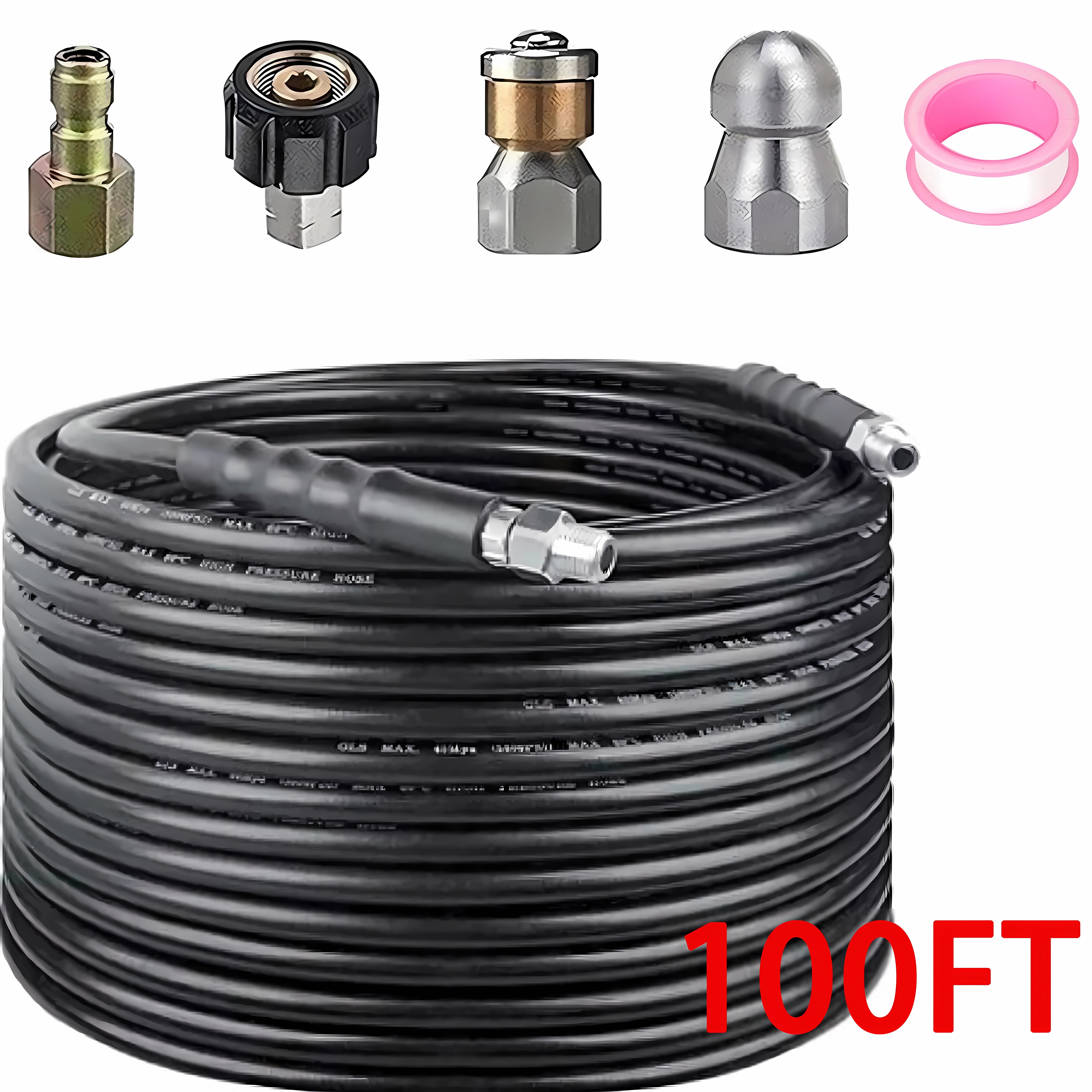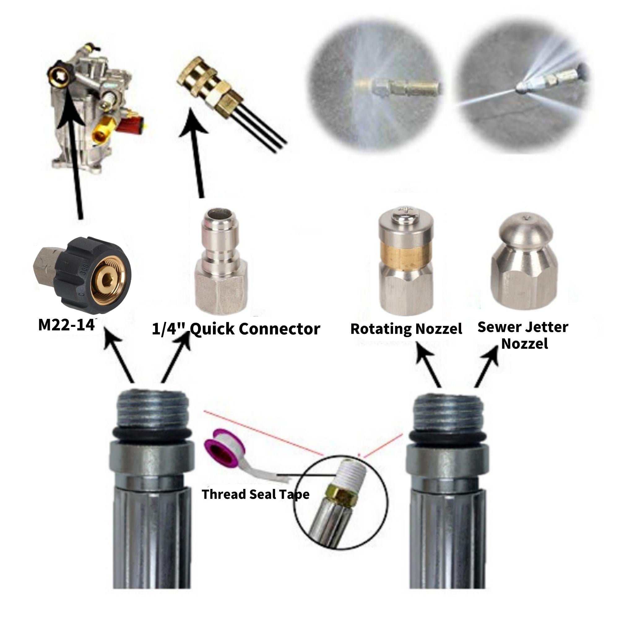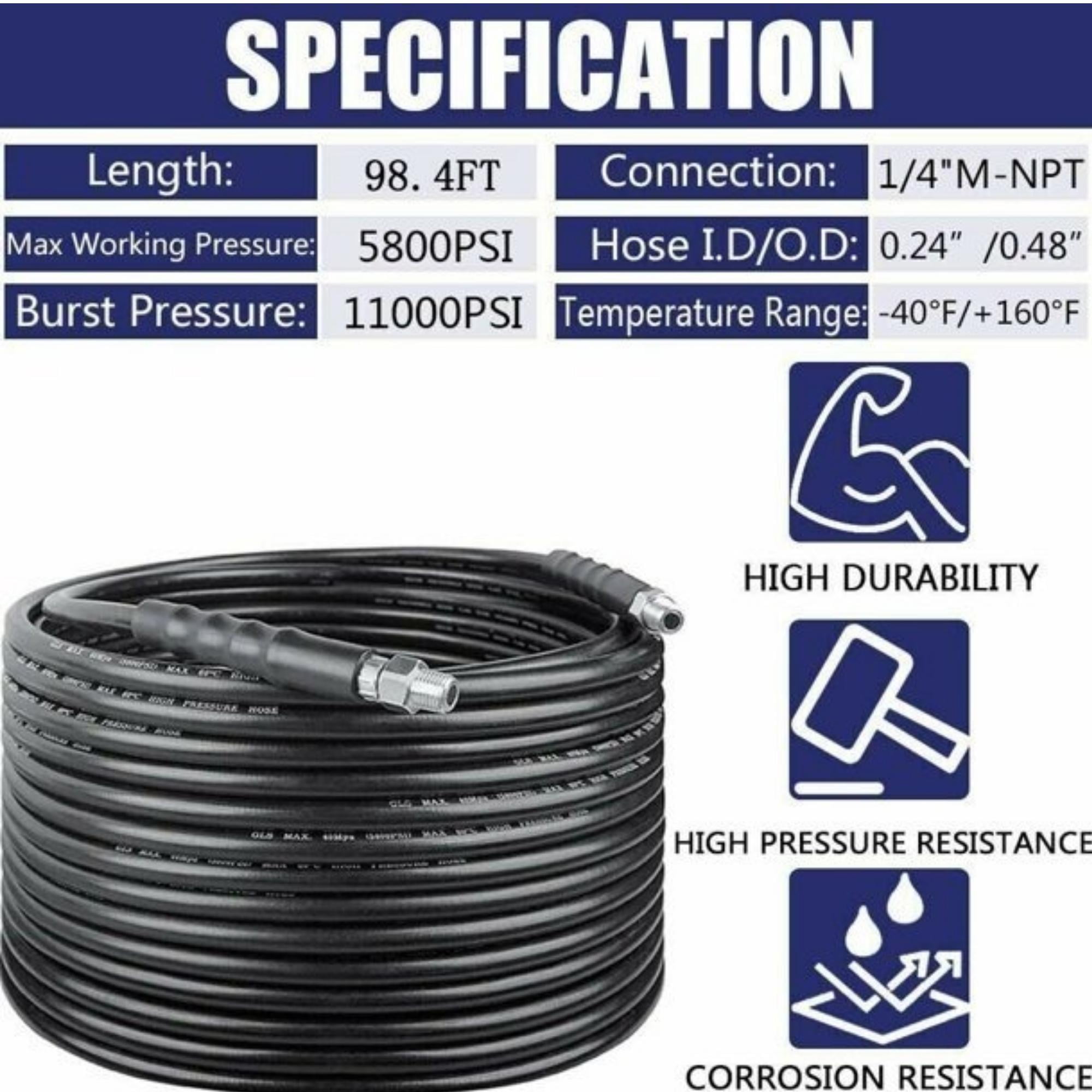 【UPGRADED SEWER JETTING HOSE】 1.The upgraded sewer jetter hose has an explosion-proof net added to the inner layer, which is made of steel mesh, which can bear greater pressure and prevent the hose from exploding. 2.Inner tube is made of thermoplastic polyester, which provides strong toughness.Cover layer is made of thermoplastic polyurethane, which can resist oil, weather, ozone and abrasion. There is a protective cover on both ends of the hose to prevent the end of the hose from disconnecting. 【PROFESSIONAL SEWER JETTER KIT】 Sewer jetting kit includes sewer jet hose 100 FT,button nose sewer jetter nozzle, rotating sewer jet nozzle,1/4’’ quick coupler plug,coupler (female M22 to female 1/4’’ NPT) and waterproof tape. 【HIGH ADAPTABILITY】 Sewer Jetter parts for Pressure Washer can help you unblock More types of indoor and outdoor drainage devices, combined with any brand of pressure washer, can easily flush obstructions.Working pressure is rated to 5800 PSI. Burst pressure is rated to 11000 PSI. 【BUTTON NOSE AND ROTATING NOZZLE】 1.Button Nose 4.0 Orifice.1 front jet at 0°that clears blockages.3 rear jets at 33° flush out debris loosened by the front jet.1/4″ Female Fitting – Fits 1/4″ NPT male sewer jet hose fittings. 2.Rotating Sewer Jetter Nozzle 3 backward rotating spray blasts into clogged pipe and moves the nozzle through pipe. The nozzle is easy to slide into drain pipes and sewer lines.The orifice is 4.5.Fits sewer jet hose with 1/4″ male end. 1/4″ Female NPT Fitting. 【QUICK CONNECT PLUG AND FEMALE METRIC M22 TO 1/4 INCH FEMALE NPT FITTING】 1.Quick Connect Plug used in a lot of situations where high pressure connections are frequently assembled or disassembled.Ideal for quick exchange of pressure washer outlet, sewer jetter hose, guns and nozzles. 2.It makes a solid connection with quick coupler each time.Pressure washer coupler convert metric M22 14mm female NPT thread to 1/4″ Female NPT.