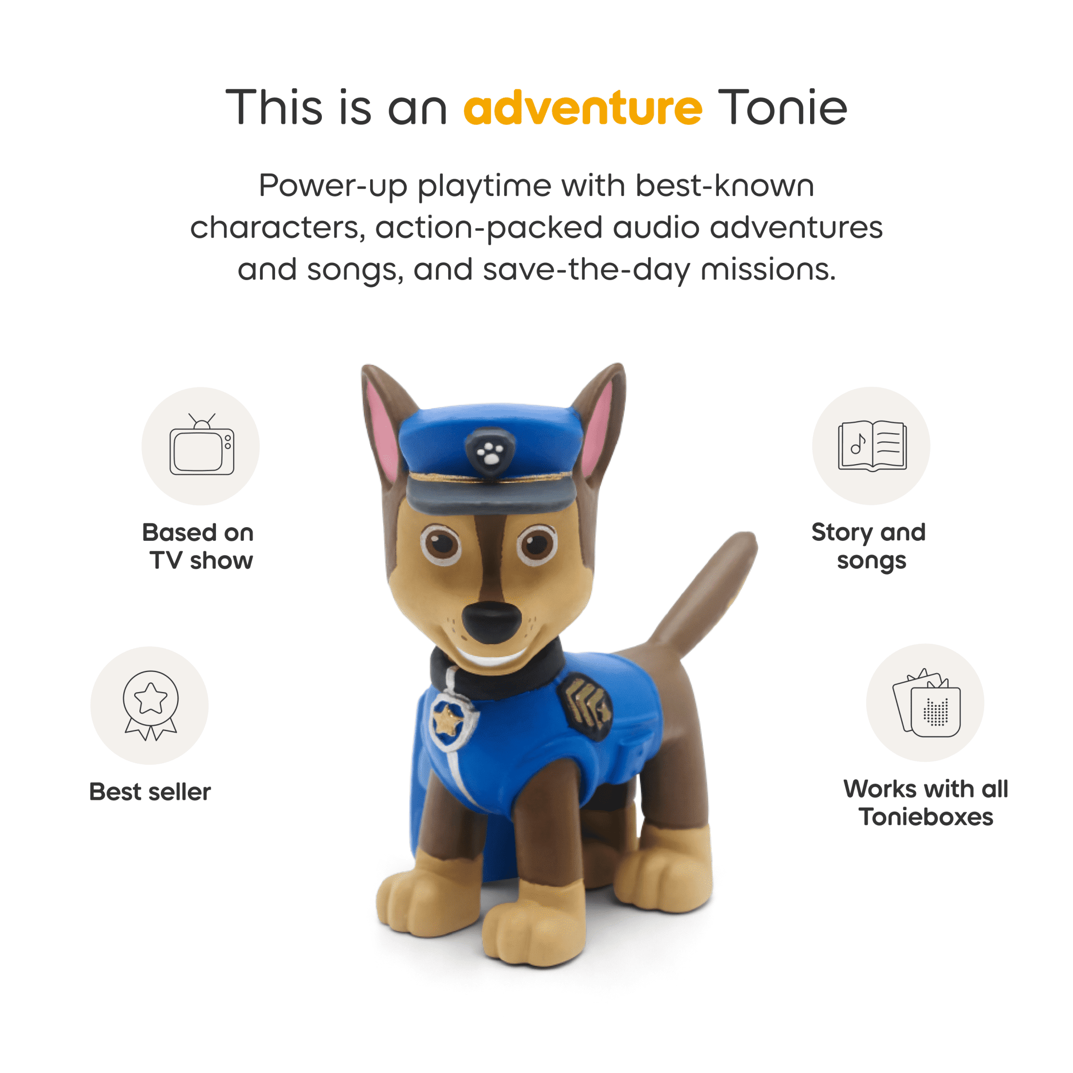 Tonies Paw Patrol Toniebox Audio Player Starter Set with Chase, for Kids 3+, Light Blue The Toniebox is an imagination-building, screen-free digital listening experience that plays stories, songs, and more. Designed to foster imagination and active play for children ages three and up, it’s everything a young explorer’s growing mind needs! The Toniebox puts control of storytime in the hands of your little listener. Even swapping stories is simple. Just place a different Tonie on the box to begin a new adventure! Weight: 3 lbs