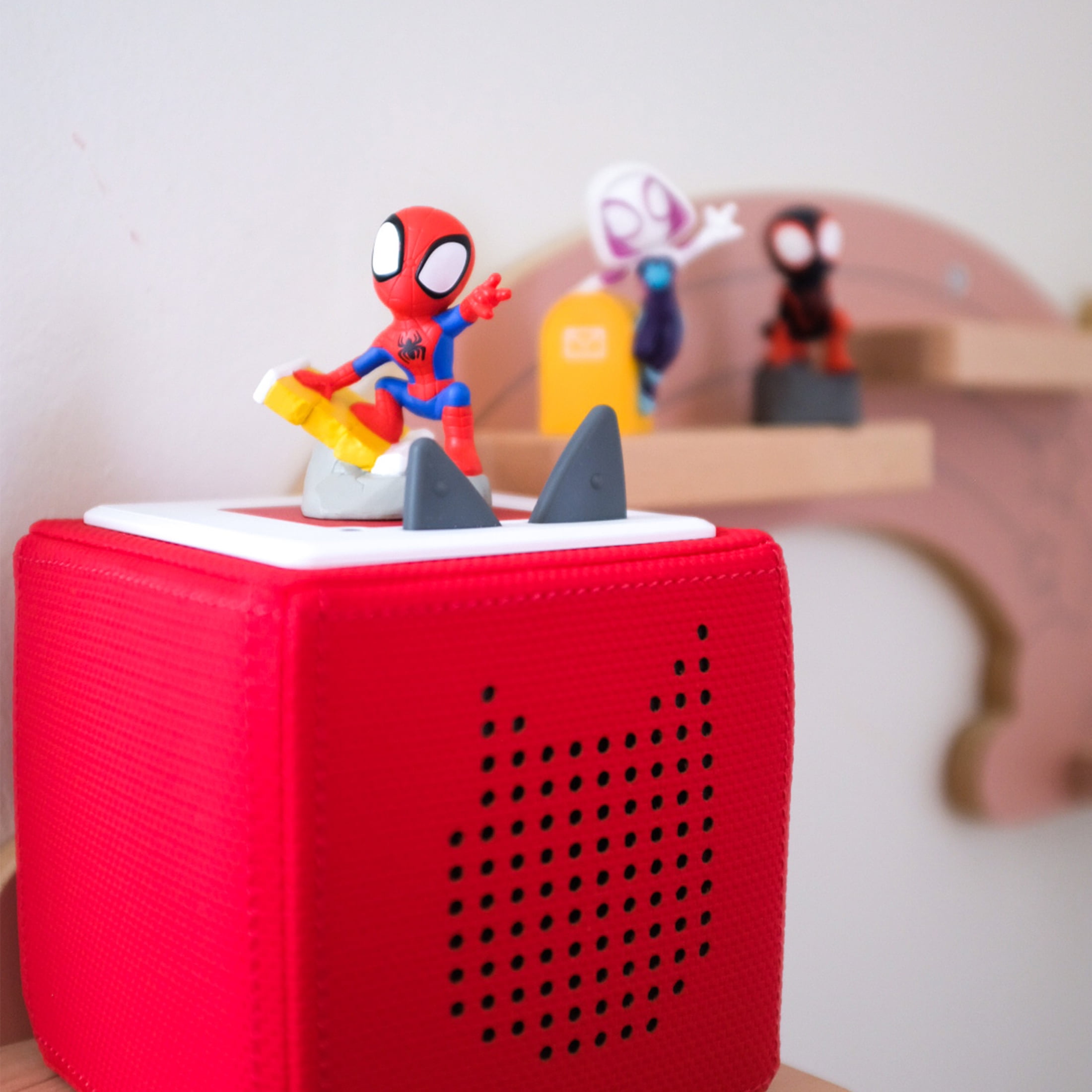 Meet the Toniebox Your lovable little storytime friend The Toniebox is a new audio system designed for little listeners ages three and up. Turn it on, pop a Tonie on top and let the adventure begin! Tonies bring your family a screen-free, imagination-building experience unlike anything else, and each Tonie brings new stories or songs! The Toniebox is designed for the way kids play with intuitive controls that little ones can use to foster independent, active play, as well as being huggable, durable and portable. Hug it, bump it or squeeze it- your little one is in control of their listening adventures! Help your kids discover all the wonders and joy of storytelling and singalong fun. This Bundle includes a red color Toniebox, Spidey, Ghost-Spider, and Spin Tonies figurines. It also includes a charging station to power your Toniebox battery (up to 7 hours of battery life) and an instruction manual. These Tonies teaches kids about: Problem solving, Teamwork and Perseverance