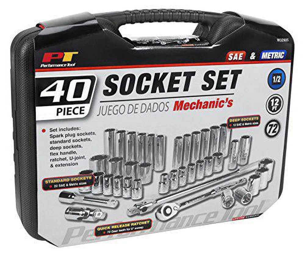 Features High Torque Quick Release Ratchet 72 Gear Teeth For 5 Degree Sweep And Smaller Head For Tight Areas 12 Point SAE And Metric Standard And Deep Wall Sockets Chrome Vanadium Alloy Steel For Strength And Durability Durable Storage Case Also Included Limited Lifetime Warranty