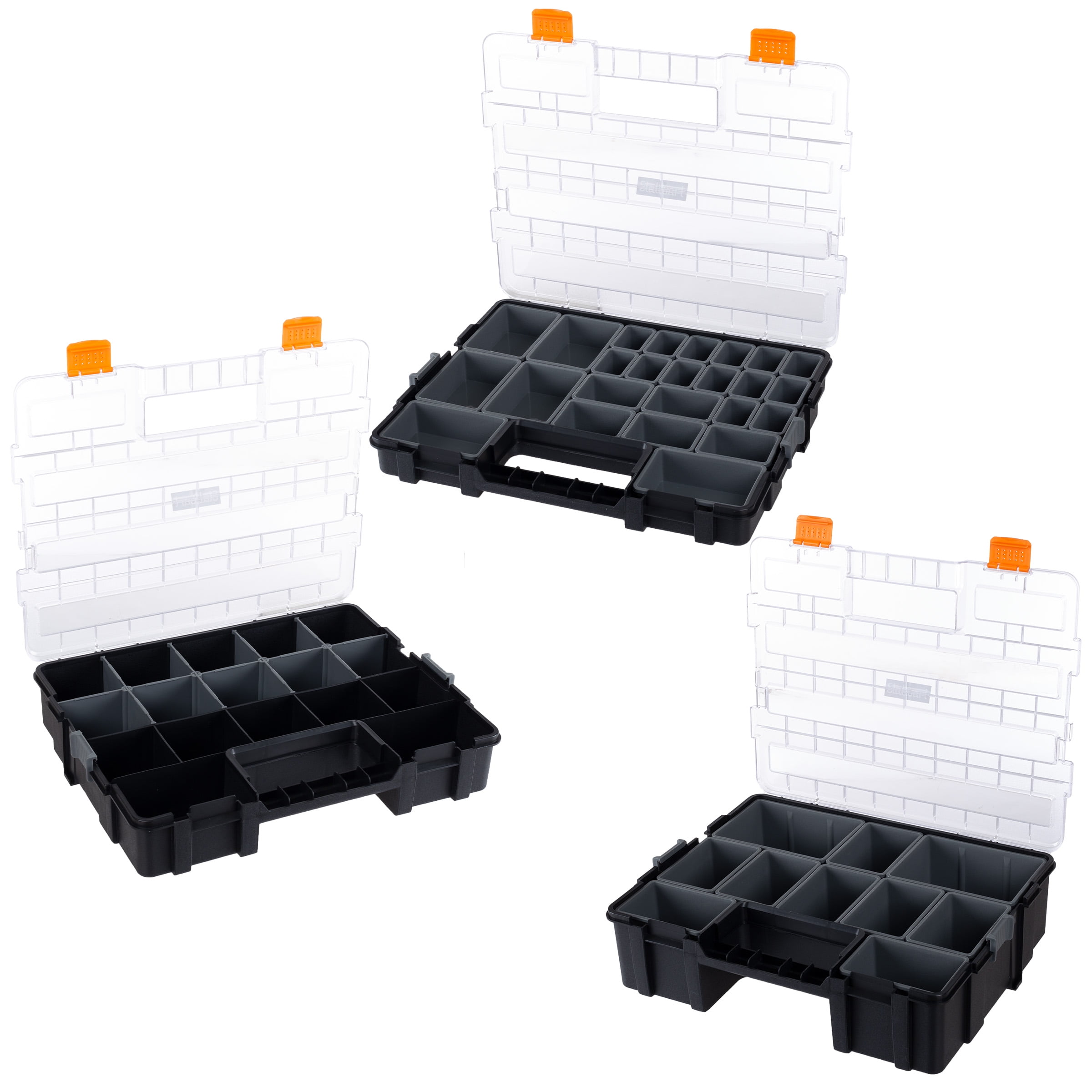 3-TIER COMPARTMENT ORGANIZER – This Stalwart toolbox organization solution features 52 customizable compartments, providing an easy way to sort and store hardware, craft supplies, or tackle. SMART DESIGN – The screw organizer box features 3 interlocking trays with clear lids and removable dividers that allow you to customize the compartments. STRONG CONSTRUCTION – This small parts organizer is built to withstand use during tough do-it-yourself home improvement jobs and keep your items safe through the wear and tear of travel and regular use.