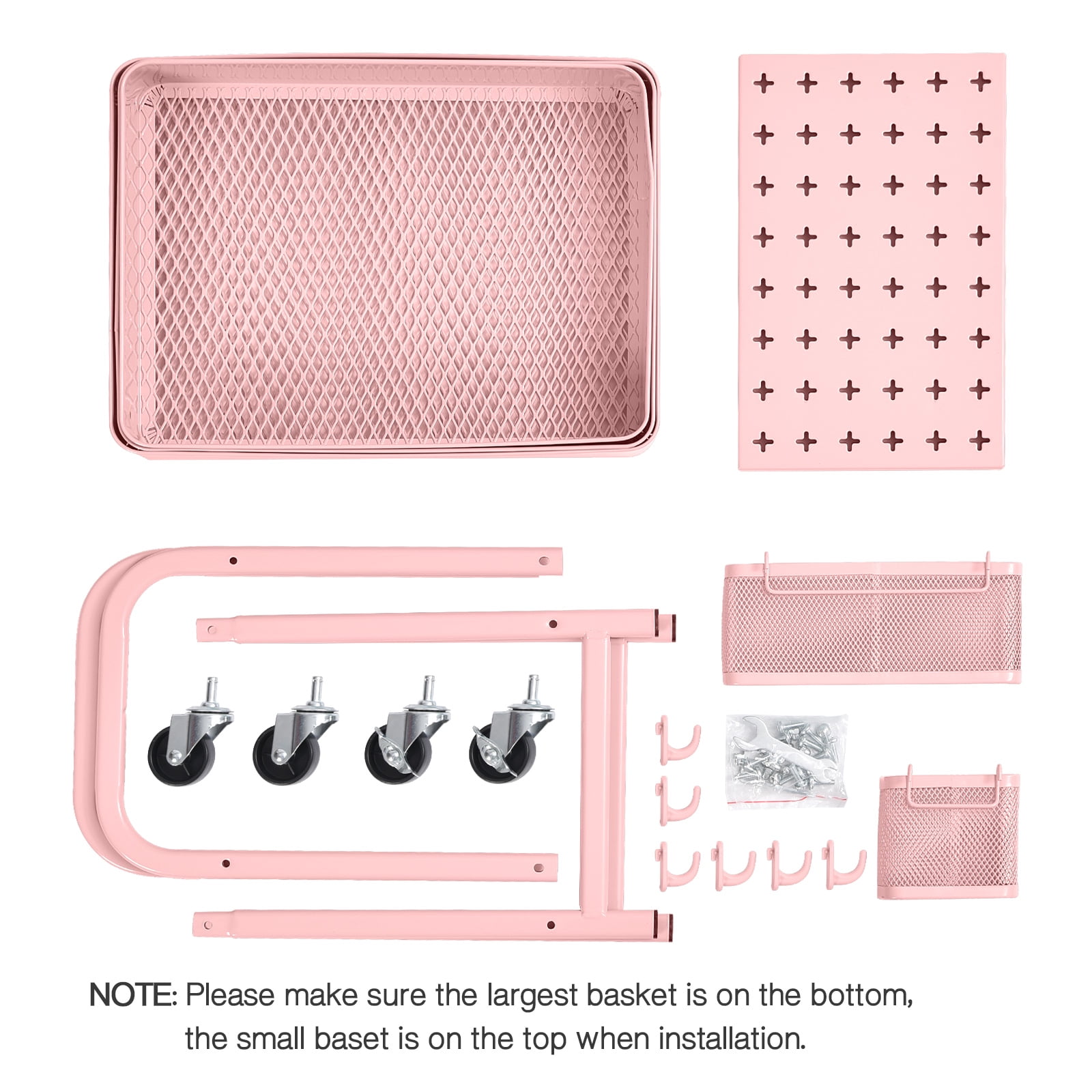 EXPLORE THE UTILITY for APPLICATION EXPLORE THE PEGBOARD for STORAGE EXPLORE THE WHEELS for ROLLING EXPLORE THE MATERIAL for DURABILITY EXPLORE MORE Designed for creating extra storage space, this functional storage cart is friendly for space-saving and easy transport. Not only for pantry, kitchen, livingroom, bedroom, laundry room. But also perfect for office suppliers, classroom appliance, and hosipital suppliers. The side pegboards are effective to hang the things you want to organize. Compared with the ordinary trolley, our improved pegboard cart consists of perforated steel pegboard on BOTH SIDES which can DIY according to your preferences and needs! In addition 2 bins, 6 hooks are included, creating more possibilities on abundant space for variety storage. There are 4 heavy duty casters, it keeps silent when moving, and can be rotated 360°. 2 lockable wheels metal brakes to allow a stable stop even on a slope. The utility “U” shape handle is convenient to push the rolling cart with wheels to any place or fixed position. This serving dual pegboard cart is well constructed with high quality material, structured with heavy sturdy frame and sleek powder coated finish which is anti-rust. The better weight capacity for each shelf is up to 44 LB. As well as its mesh basket hollow design also has breathable function. Available 3 Colors: Grey / Pink / Light Green. Product Size: 17.05 x 4.65 x 12.91 inches. It is easy to follow the installation manual to assemble the cart. Feel free to get touch with our service assistant for any issue.