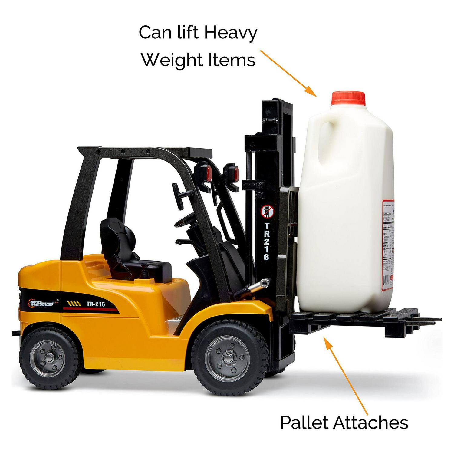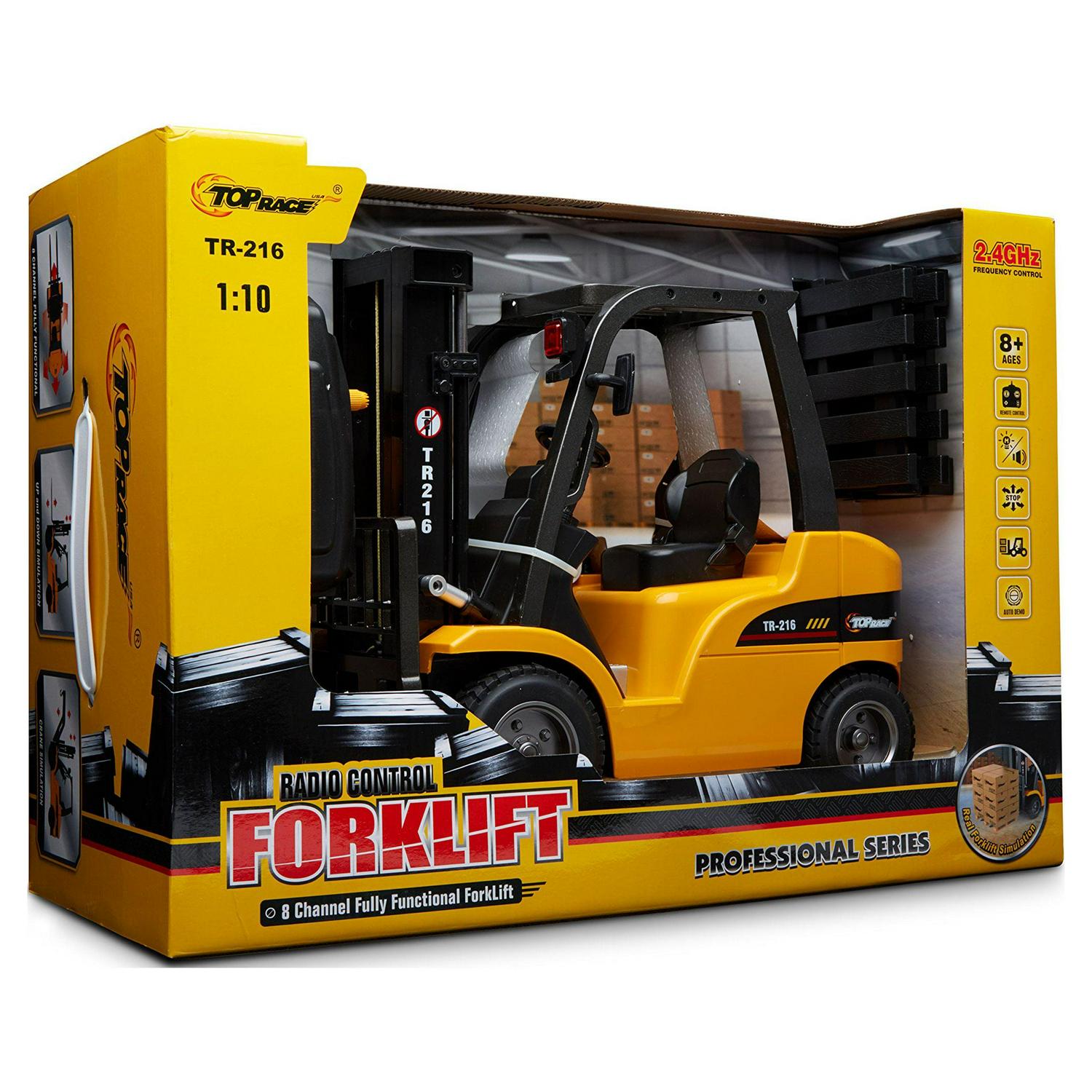 – BIG & POWERFUL: Built to a large 1:10 scale, this remote control construction toy forklift measures 13 inches tall, and the fork extends to another 15″ high. The Top Race RC forklift with its powerful motors can lift cargo up to 6 lbs and can pull an enormous weight of up to 26 lbs. The forklift will provide hours of fun