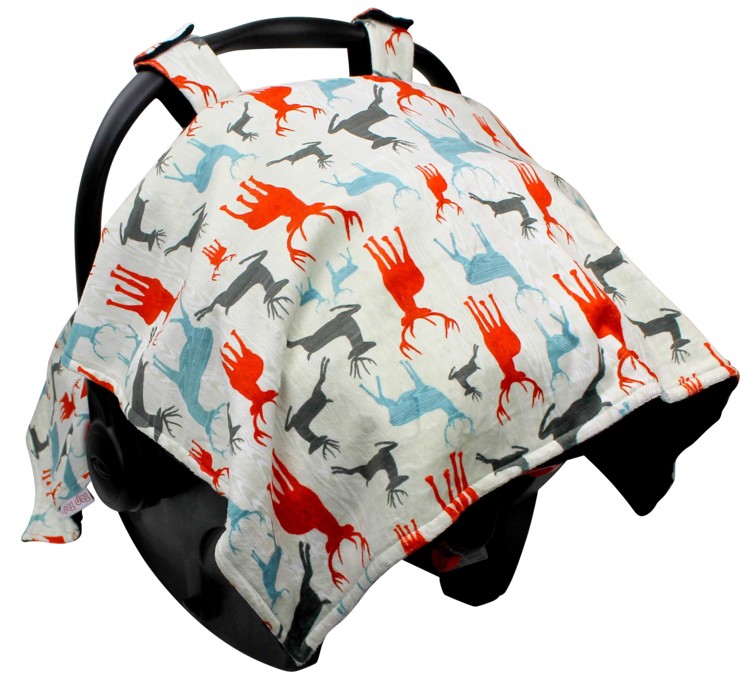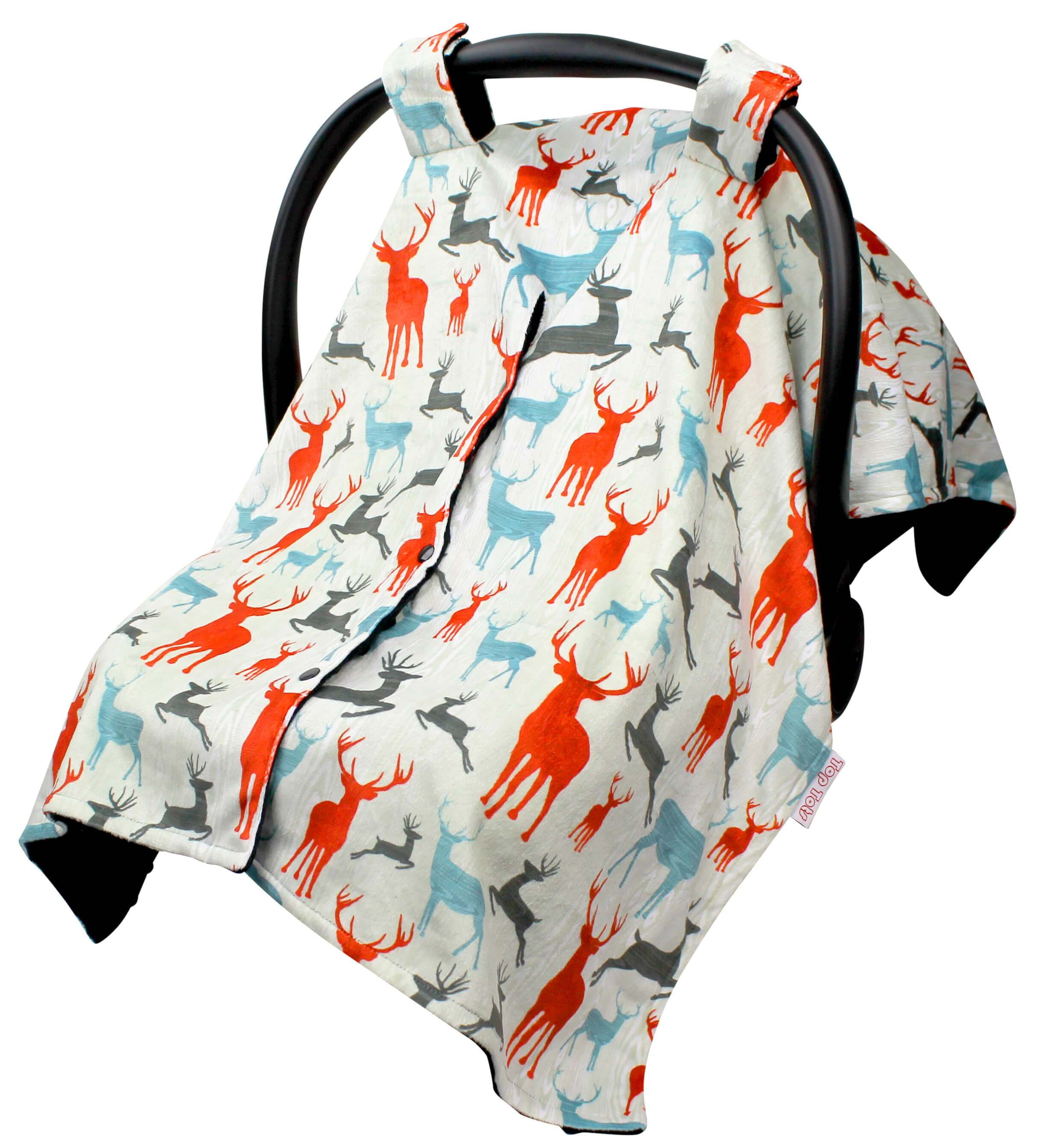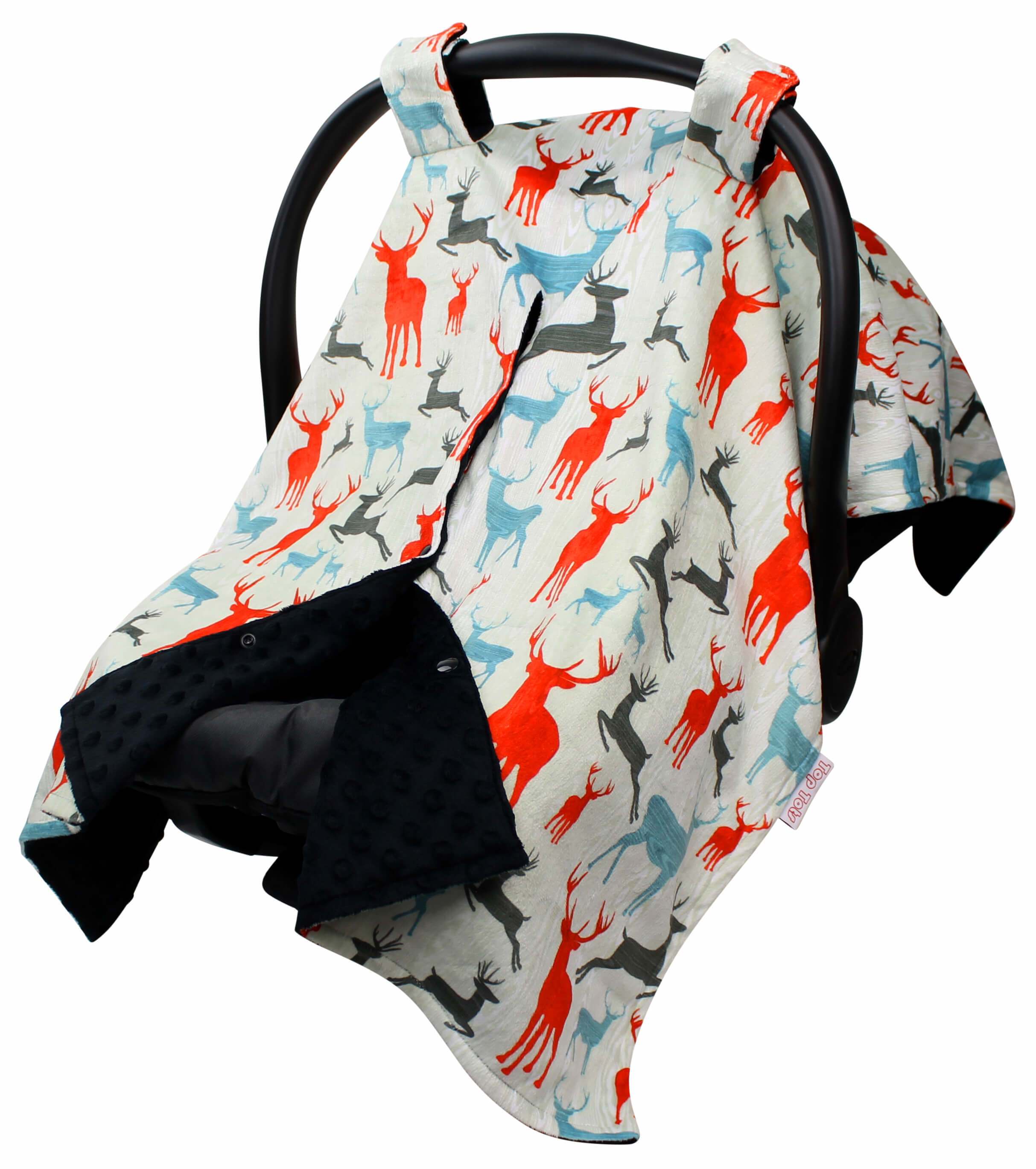 Top Tots Deluxe Minky Car Seat Canopy for Baby Boy or Girl, Red Blue Black Deer