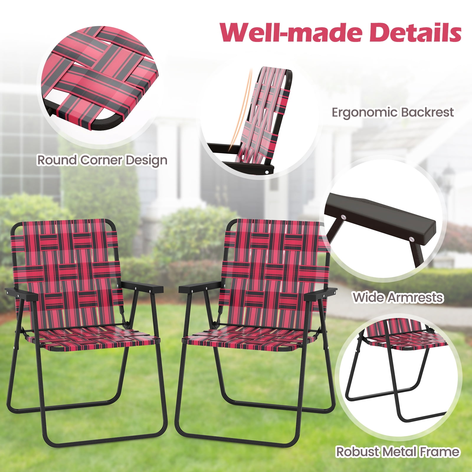 Upgrade your outdoor relaxation with this set of 2 folding webbed lawn chairs! Crafted from heavy-duty metal frame, these folding chairs are perfect for any outdoor setting, from poolside lounging to beachside relaxation. The lightweight and foldable design makes them easy to transport and store, while the comfortable webbed seating ensures hours of relaxation. Besides, the ergonomic backrest and wide armrests offer added comfort and support. Whether you’re hosting a backyard gathering, going camping or picnic, these chairs are a perfect choice. Features Heavy duty metal frame offers steady support and durability Breathable webbed chair back and seat keep you cool on hot days Ergonomic design with slanted backrests and wide armrests Easy to store and carry with lightweight and foldable design Perfect for poolside, lawn, yard, beach or camping trips Specifications: Color:Red Material: PE, Metal Overall Dimensions: 23” x 22.5” x 31” (L x W x H) Folding Dimensions: 29.5” x 22.5” x 3”(L x W x Thickness) Seat Height: 16” Seat Depth: 16” Total Net Weight: 14 lbs Weight Capacity: 330 lbs Package Includes: 2 x Folding Beach Chairs 1 x Instruction