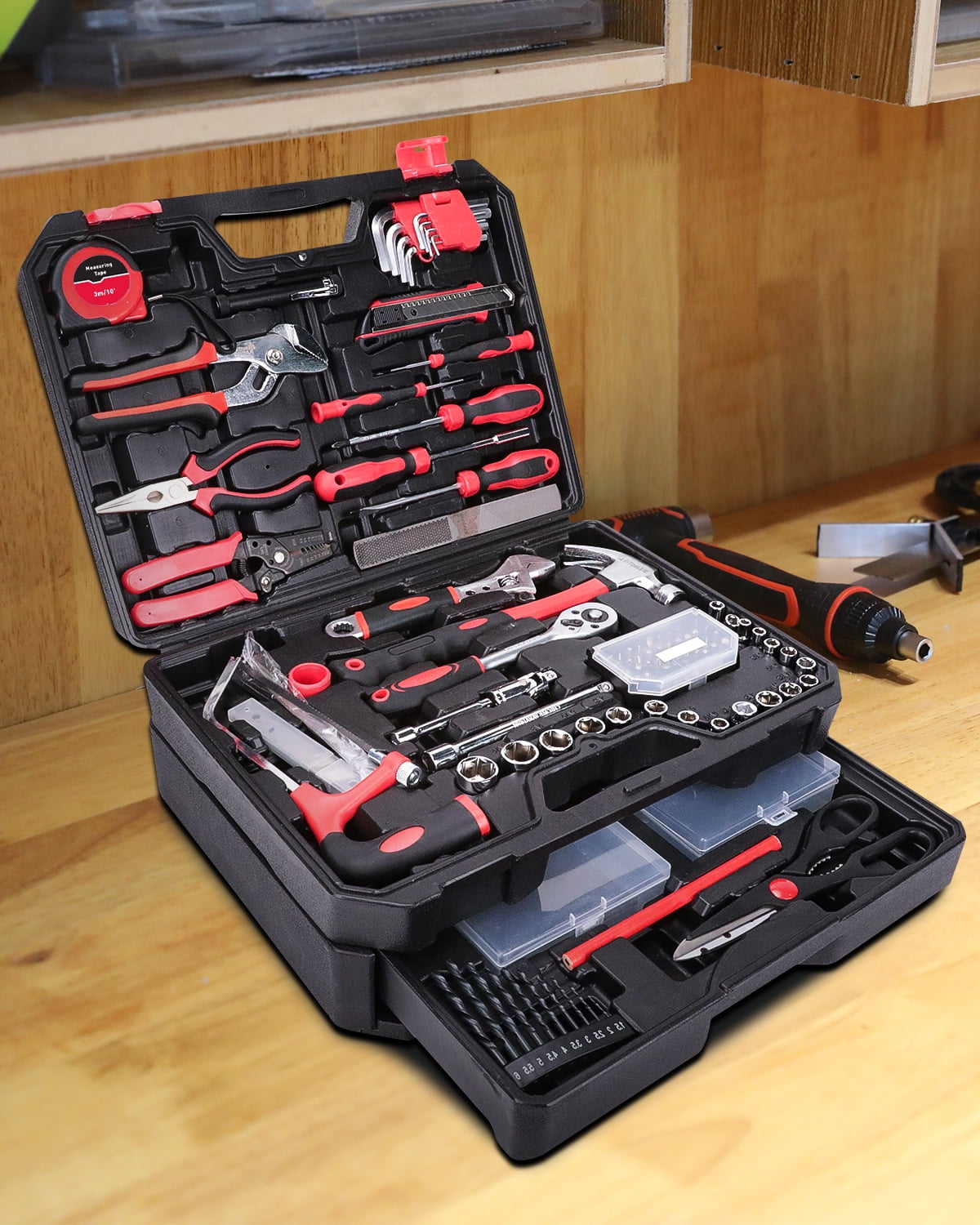 [Multi-Purpose Tool Kit] – Our 325-piece tool kit is perfect for a wide range of small repair and home DIY projects. It’s ideal for handymen, construction workers, mechanics, workshops, and more. [Wide Variety] – We offer a comprehensive range of professional-grade wrenches, complete sets of 1/4-inch and 3/8-inch metric socket sizes, precision screwdrivers, hammers, tape measures, pliers, and more. Our 72-tooth ratcheting wrenches come with a variety of 1/4-inch screwdriver heads: Phillips, slotted, square, star, and pozi. The soft handles on screwdrivers, pliers, and hammers provide excellent comfort and control. [Includes Toolbox] – This kit comes with a drawer-style storage chest featuring separate sliding drawers, offering more storage capacity than a typical toolbox. All the essential tools are neatly organized within one durable plastic chest, complete with molded internal compartments that protect each component and make them easily accessible. All tools meet or exceed ANSI standards. [High-Quality Materials] – Crafted from premium-grade steel, the surface undergoes heat-treated chrome plating, ensuring long-lasting durability and resistance to corrosion. The handles are made from TPR material, providing a comfortable grip. [Perfect Gift Choice] – This tool kit is easy to carry and store, making it a great gift for both men and women.