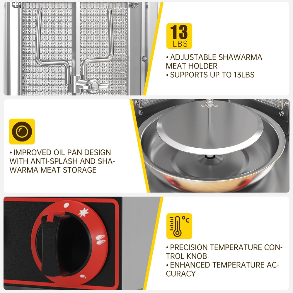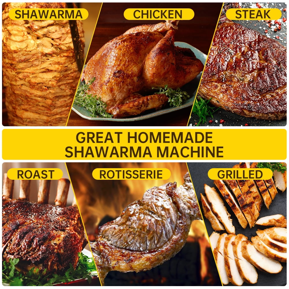 Introducing the Spinning Grillers – your culinary partner for crafting delectable Chicken Shawarma, Turkey Shawarma, Beef Shawarma, Lamb Shawarma, Gyros, Doner Kabob, and Tacos al Pastor. Constructed with top-tier Stainless Steel, this grill features two burners designed to sear meat to perfection: crisp on the outside and sumptuously juicy on the inside.
