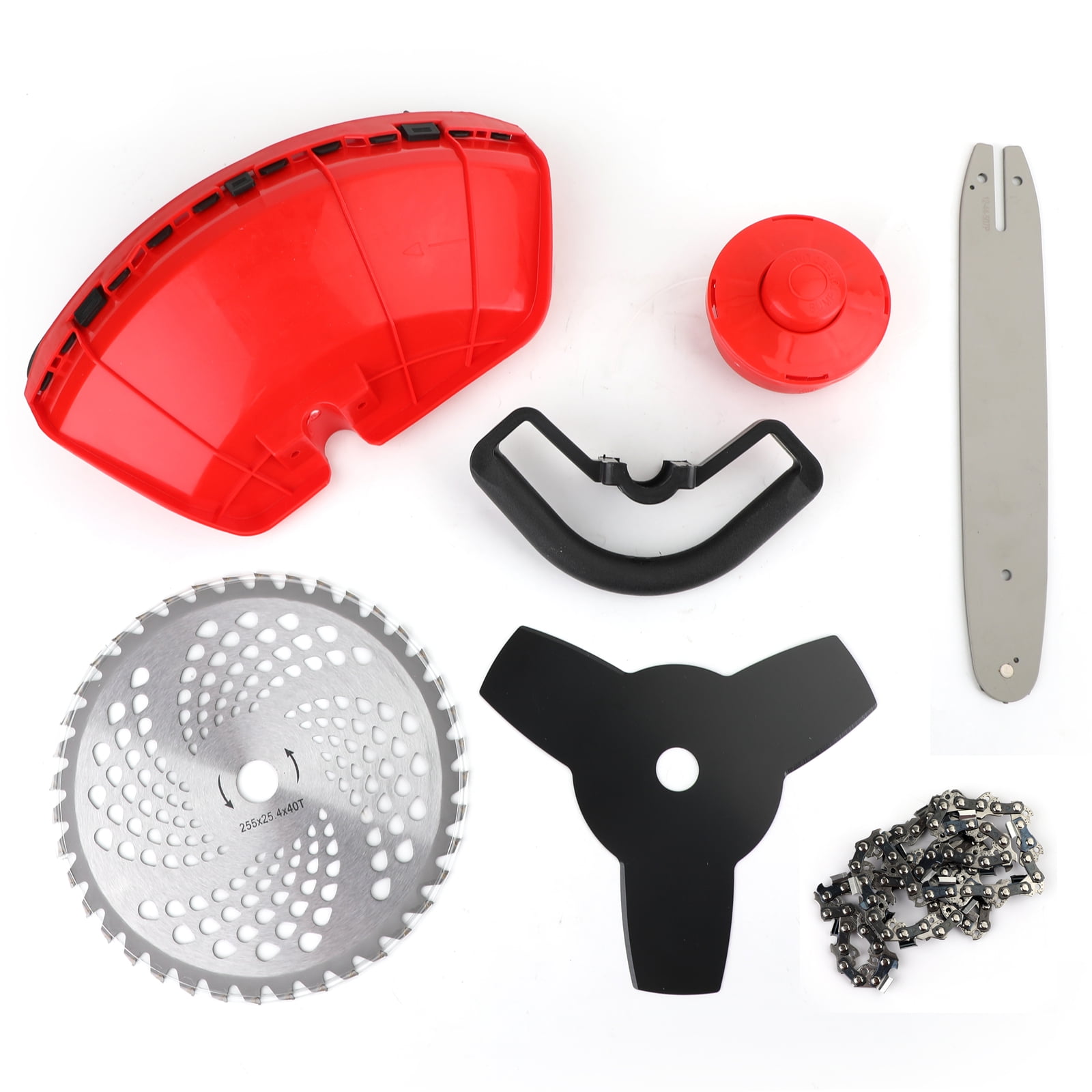 5-in-1 Multi-Tool that empowers you to tackle all your garden tasks with ease. From neatening your grassy edges with the strimmer to trimming bushes and roots with the brush cutter, pruning hedges and bushes with the hedge trimmer, and handling tougher branches with the chainsaw, this tool has got you covered. Powered by a robust 52cc 2-stroke motor, it delivers long-lasting endurance and high-speed operation. Crafted from premium plastic and metal materials, it ensures wear resistance and durability for long-term use. The ergonomic handle design provides a comfortable grip, enhancing your working efficiency. Equipped with a brush cutter, pruner, strimmer, hedge trimmer, and extension pole, this tool offers incredible versatility and convenience. Your safety is our priority. The package includes free safety work gloves to protect your hands. Additionally, the vibration reduction shoulder harness, ear defenders, and face shield offer added protection and support while working. Our Multi-Tool features an EPA certified engine, emitting minimal fuel gas during use to safeguard the environment and human health. The brush cutter blade attachment boasts a multi-tooth heavy-duty blade and long rod, making it ideal for cutting thick brambles, shrubs, weeds, brush, nettles, and thick overgrowth. Upgrade your gardening game with our powerful and reliable 5-in-1 Multi-Tool. Specifications: Engine type: 2-stroke Engine working speed: 8000-9500 RPM Engine speed idling: 3000 RPM Extension pole: 33.46 inches (85 cm)Package Included: (Same as pictures show) 1x 52CC Engine 1x Extension pole 1x Chain 1x Saw blade 1x Gloves 1x Ear defenders 1x Fuel mixing bottle (without oil) 1x Belt/Shoulder Strap 1x Toolkit 1x Brushcutter Some accessories Notes: Please allow 0.39-1.18 inches differs due to manual measurement. Enhance your gardening arsenal with our comprehensive 5-in-1 Multi-Tool, featuring a powerful 52CC engine and versatile attachments for grass trimming, brush cutting, hedge trimming, and chainsaw tasks. The ergonomic design ensures comfortable use, and the package includes essential accessories to support your gardening endeavors.