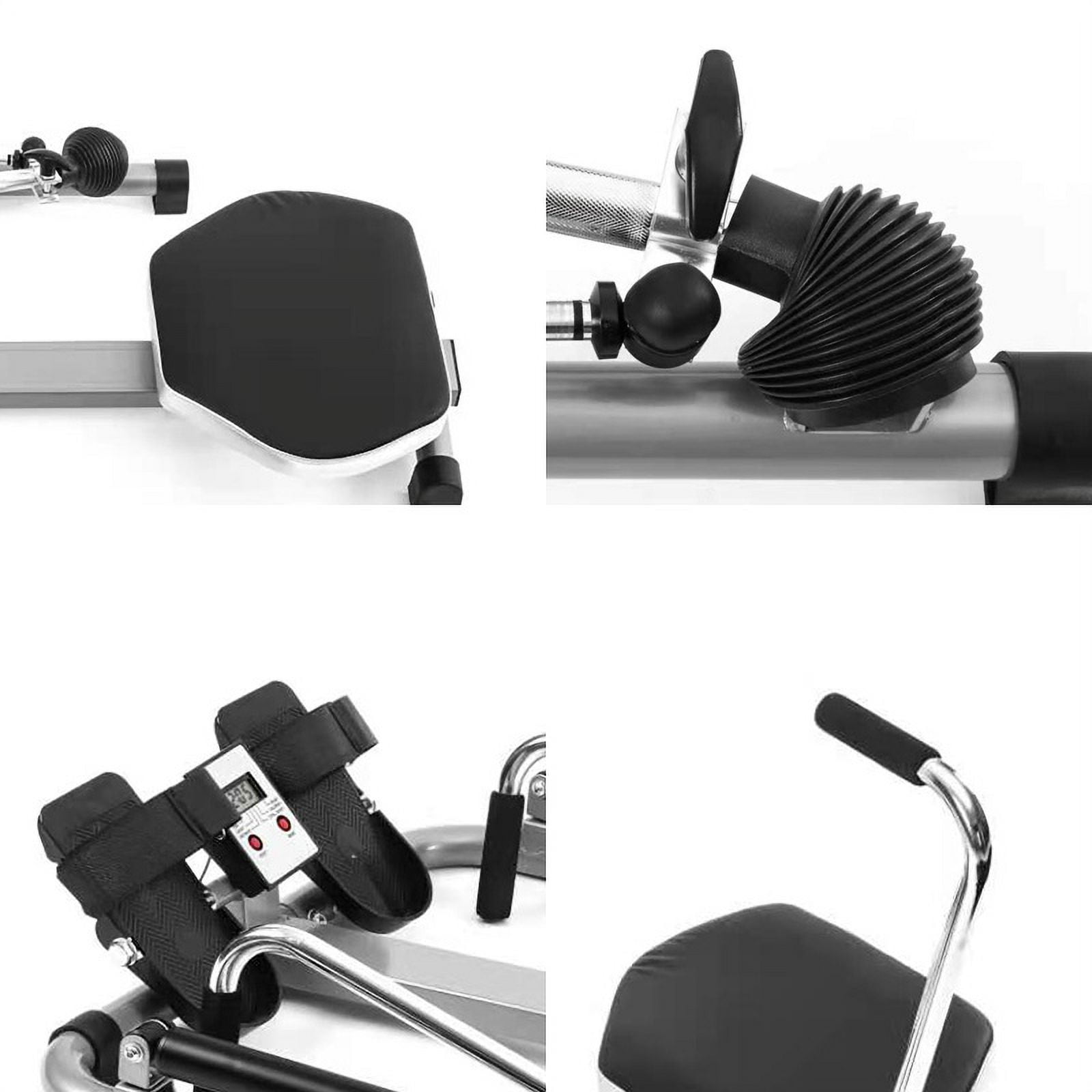 Home Gym Adjustable Exercise Rowing Machine Home Gym Adjustable Exercise Rowing Machine Rower with Double Hydraulic Resistance Enhance your home gym with this top-quality Adjustable Exercise Rowing Machine. Designed for efficient rowing exercises, it features adjustable hydraulic resistance for a personalized workout, accommodating users of all fitness levels. Key Features Adjustable Twin-hydraulic Resistance: Engage in a challenging workout with fluid resistance. Features a 360-degree rotating arm for a natural rowing experience. Digital Monitor: Track your progress with an LCD monitor displaying time, count, distance, and calories burned. Comfort Design: Extra wide pedal and cushioned seat for enhanced comfort and longer workouts. Easy Assembly & Storage: Quick setup in 20 minutes and slim storage profile with transportation wheels for easy movement. Solid & Durable: Heavy-duty steel frame supports up to 260 lbs, with non-skid rubber feet and comfortable grip handles. Product Specifications Material Iron, Plastic, PU Color Black/Gray Weight Capacity 250 lbs (120KG) Resistance Mechanism Hydraulic Department Unisex Dimensions (LxWxH) 51 x 45 x 3.9 inches (130*115*10CM) Package Content 1 x Rowing Machine (with accessories and tools) 1 x Manual Note: The actual color of the item may vary due to differences in monitor displays.