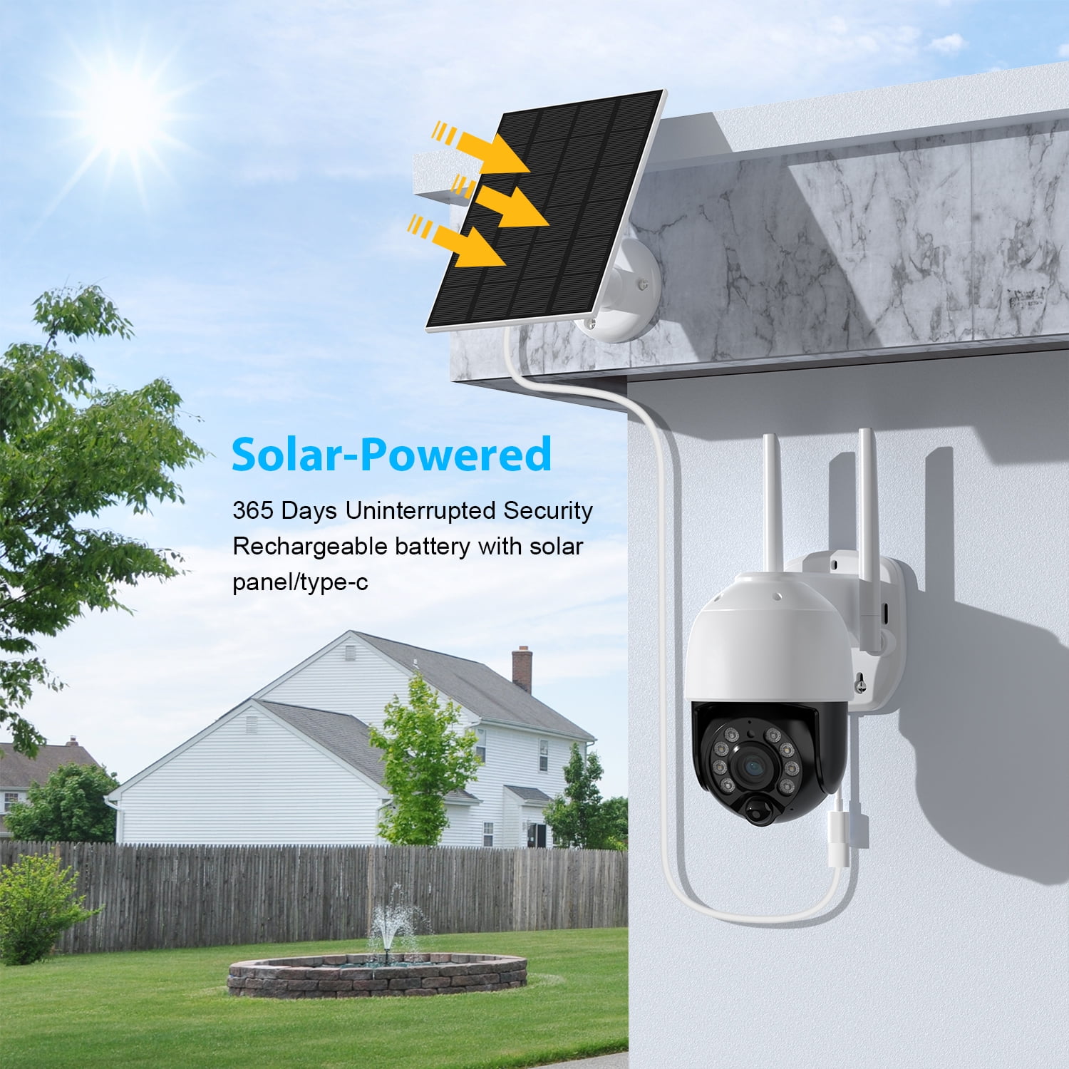 TOPVISION Wireless Solar Security Camera is a top-notch security device that is built to keep your home, office, or property completely safe. With its state-of-the-art technology and advanced features, this wireless security camera is the perfect solution for anyone looking to secure their premises. 🌞2.5K Image & Night Vision This security camera outdoor has a 1/2.8″ CMOS Q03 sensor and XM650 ISP, which allows it to capture 3 Mega-Pixels resolution at a frame rate of 25fps, with a resolution of 2288*1288. The camera’s 110° wide-angle lens ensures that you get a wide view of your surroundings, and the four Infra-Red and four white light LEDs provide clear night vision up to 50 meters. 🌞Advanced Audio Communication In addition to its impressive video capabilities, our Wireless Solar PTZ Camera also has 2-way audio communication with noise-cancellation technology. This allows you to talk to people on the other end of the camera in real time, which is perfect for monitoring your children or pets when you’re not there. 🌞PTZ Functionality & Remote Monitoring The camera’s PTZ function allows you to pan up to 355°, tilt up to 90°, and digitally zoom up to 4x, giving you complete control over your viewing angle. The iCSee app lets you monitor your solar camera from anywhere and at any time. 🌞Eco-Friendly Solar Power The Security Cameras features a 3W solar panel, providing you with a renewable energy source that reduces your carbon footprint. It is made of ABS material, which makes it durable and weatherproof with an IP66 rating. 🌞Multiple Storage Options The WiFi camera offers multiple storage options, including support for cloud storage and TF card storage of up to 128GB, which ensures that you’re always informed about any potential security threats. (SD Card not included) Specification 🔔Video Sensor: 1/2.8″CMOS Q03 ISP: XM650 Resolution: 3 Mega-Pixels Frame rate: 25fps Resolution: 2288*1288 Lens: 110° wide-angle Night vision: 4pcs Infra-Red+4pcs white light LEDs, IR Range: 50M 🔔Audio Type: 2-way audio with noise-cancellation Hardware: One Microphone and one speaker 🔔Storage Cloud: Support Cloud storage TF Card: TF card max 128GB 🔔Network WiFi (2.4GHz): IEEE 802.11 b/g/n Stream: Dual stream Network Protocol: Support TCP/IP, private cloud storage, etc. transmission mode: P2P,Smart Cloud Server 🔔PTZ Pan: 355° Tilt: 90° Digital Zoom: 4X 🔔App Download: iOS in App Store, Android in Google Play Name: iCSee Device Wakeup: Within 600ms Notification: Push notification within 1 second 🔔Solar Panel Power: 3W Apex voltage: DC5V 🔔Others Power: DC5V/Solar Panel (Optional) Battery: 5000mA Material: ABS Temperature&Humidity: -20°C ~ 55 °C&10-95% RH Weatherproof: IP66
