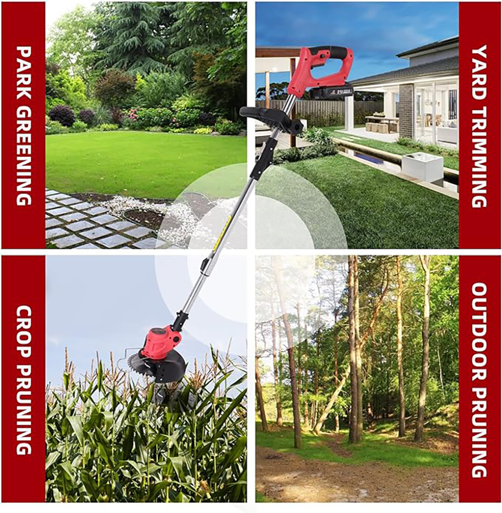 Multifunction,not only cuts grass, but also works great on weeds, thicker bushes and branch. 3-IN-1 lawn care, mow, trim, and edge with one lightweight tool. Easy to control,Steady,low vibration,won’t shake or skip. Low noise drives technique, only 92 dB won’t disturb neighbors. Durability,metal blades are far more durable than spools. No spool, doesn’t requires spool pulling and won’t tangle. Powerful Motor The grass trimmer with 600W high-power brushless motor and cutting speed up to 18000 RPM runs smoothly and quietly with no vibration. Combines maximum efficiency and ease of use. Upgraded Battery Performance High Performance MAX 21V Lithium-Ion Battery delivers fade-free power with no memory loss after charging.(up to 40 minutes of runtime/ per battery) 90° Adjustable Cutting Head Adjustable Head, The head can tilt up and down for easy trimming at multiple angles. Can go up to a fence and around the sidewalk edges. COMBINATION of 3 BLADE TYPES With interchangeable blades and adjustable head, you can use it for different yard clean-up work. Plastic blades are suitable for mowing delicate grass. Metal blades are suitable for cutting thick weeds and small shrubs. Saw blades are suitable for pruning thicker shrubs and branches. Multifunction,not only cuts grass, but also works great on weeds, thicker bushes and branch.|3-IN-1 lawn care, mow, trim, and edge with one lightweight tool.|Easy to control,Steady,low vibration,wonât shake or skip.|Low noise drives technique, only 92 dB wonât disturb neighbors.|Durability,metal blades are far more durable than spools.|No spool, doesnât requires spool pulling and won’t tangle.