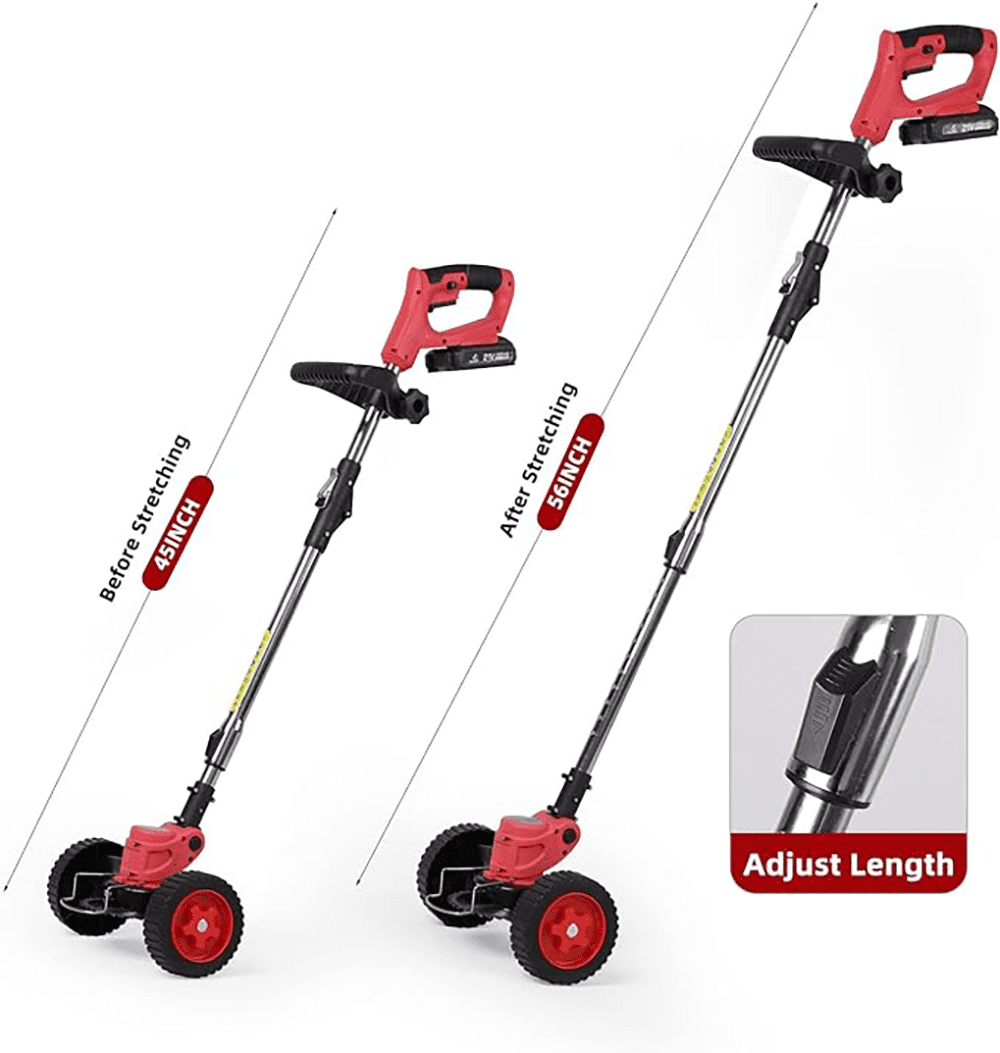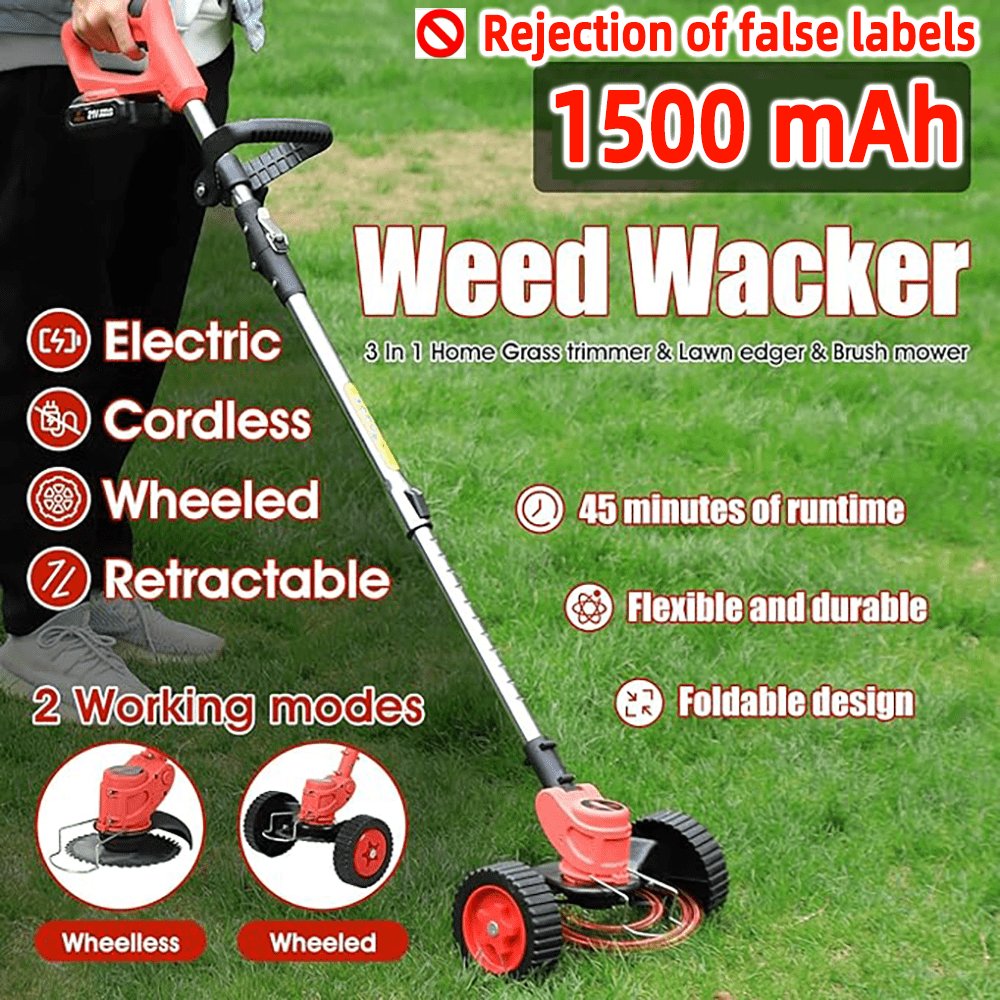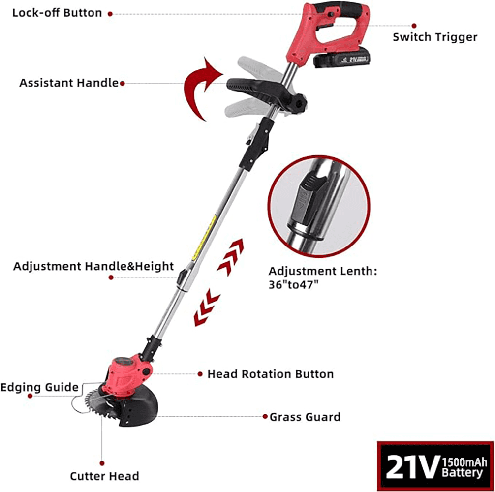 【Weed Wacker Battery Operated】 Our weed wacker cordless a superior premium motor and AAA quality battery, resulting in greater efficiency and longer lasting operation compared to other models. Electric weedwacker with multiple functions, including grass trimmer, lawn trimmer, easily converting in seconds without tools, protects your plants and landscape, lawn edger making your lawn straighter and more beautiful. 【3 Types Of Blades】 Cordless Weed wacker has different blades meet different weeding needs. Plastic blades are suitable for soft lawns, stainless steel blades are well for older weeds, and alloy saw blades are great for branches, you clean your garden quickly and easily,Weed trimmer saving much time and effort to weed as well. 【Adjustable Design】 The weedwacker is equipped with an adjustable rod, which can be adjusted freely from 35 to 47 inches.The angle of the grass cutter machine head can be adjusted from 0-90° to cut inclined lawn or hard-to-clean crevices. Helps you maintain balance while using your cordless string trimmer, reducing fatigue and increasing work efficiency.