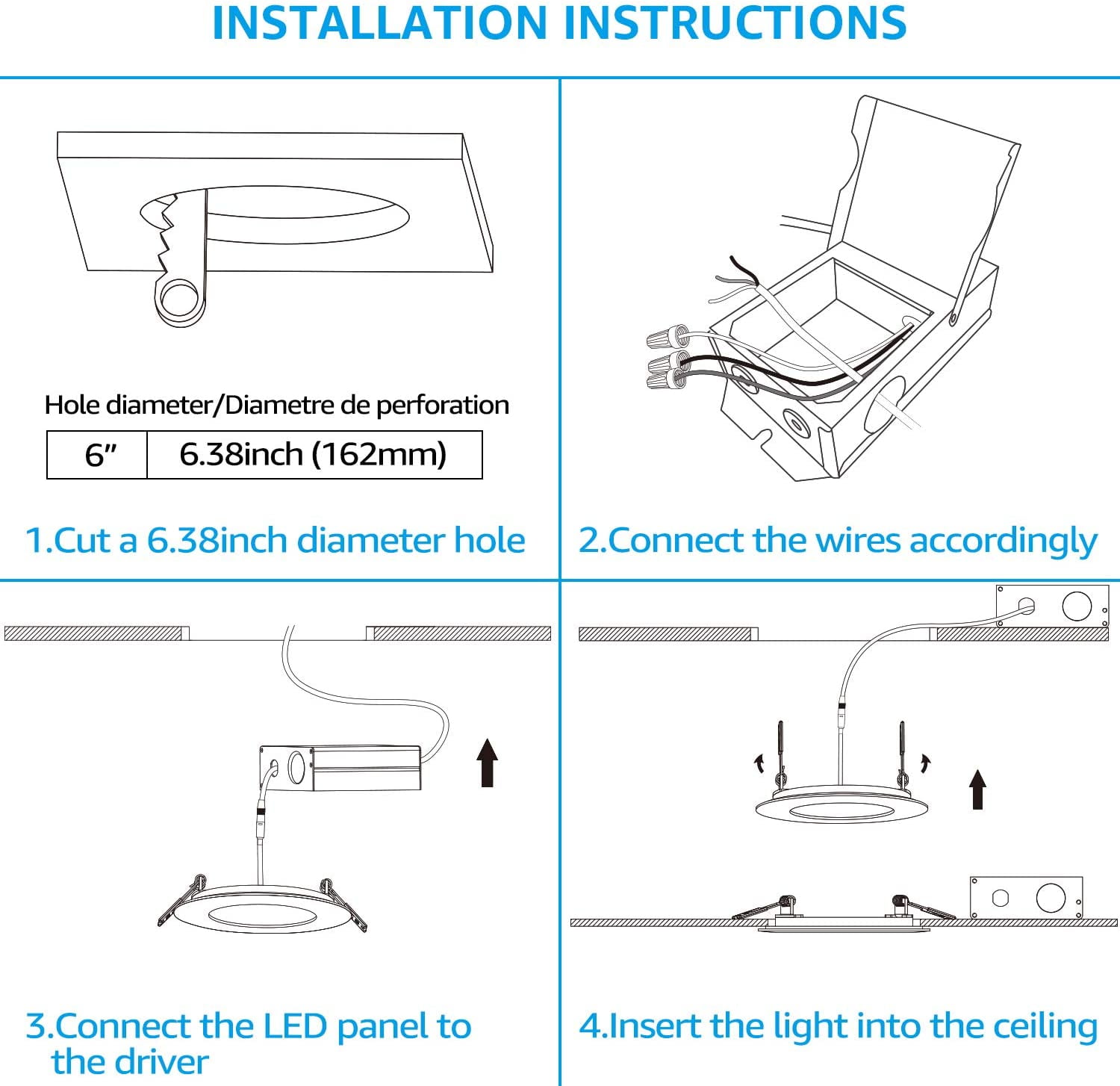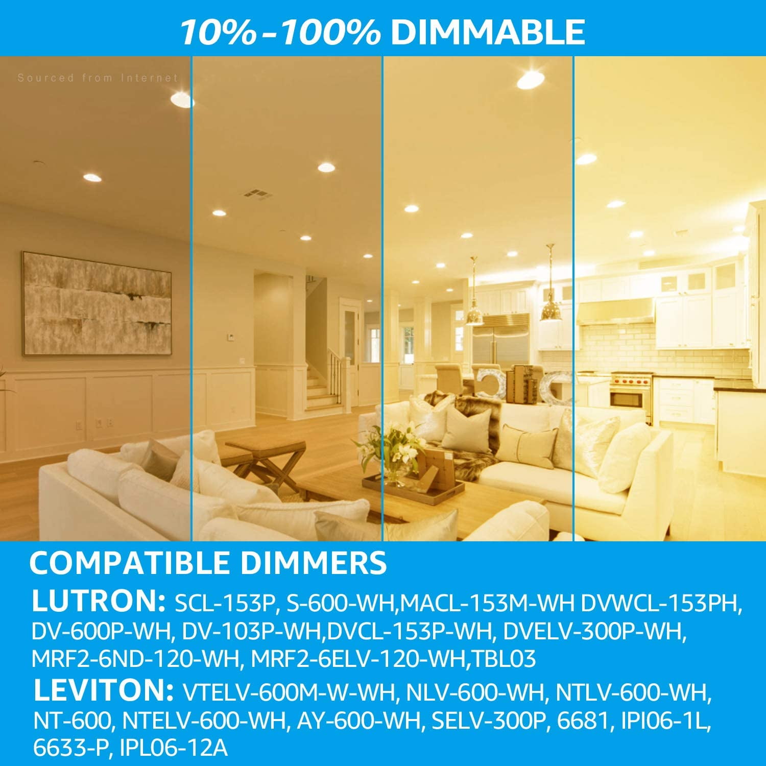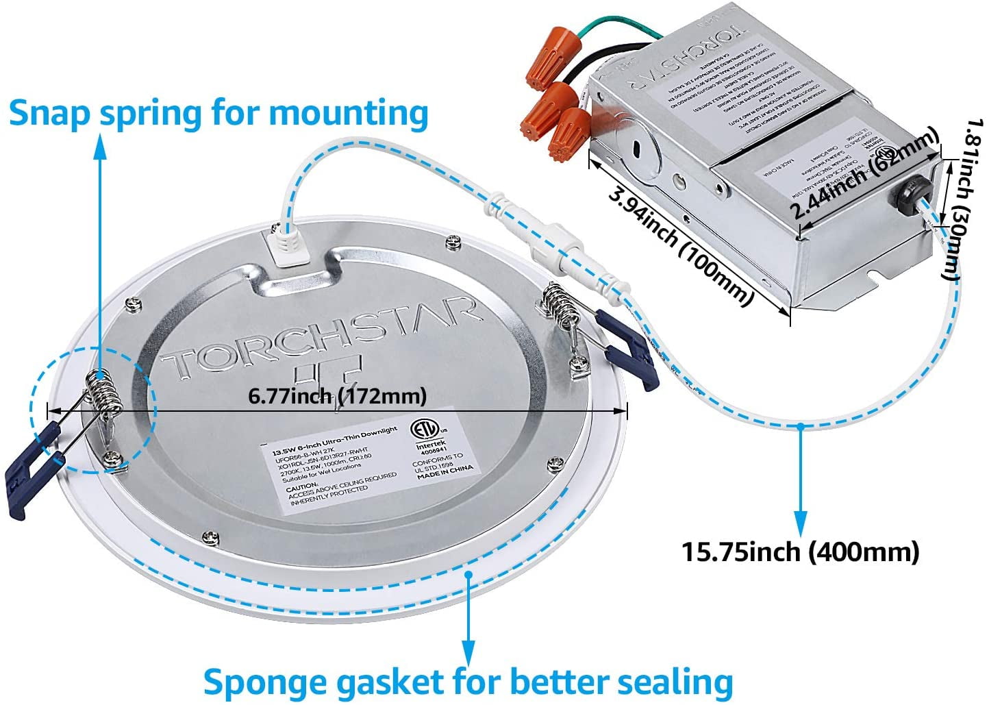 Energy SaverThis ETL & Energy Star certified light only needs 13.5W to match the output of a 75W incandescent light, saving you up to $1082.4 per set over its long 40,000hrs lifespan. It also has a scratch-resistant frosted lens that prevents glare. Ultra-Thin LightingThis LED ultra-thin downlight only needs 2 inches of ceiling space, perfect for ceilings that can’t fit a housing can. The metal springs clips firmly hold the light for easier install and lasting service. Reliable DesignThe unique waterproof male and female connectors make it great for wet locations. The IC rating lets this light be in contact with insulation so you don’t need to worry about it overheating and causing a fire. Widely UsedWith smooth 100%-10% dimming and compatible with most dimmers on the market, you can easily set the mood as you like. The 110⁰ beam angle and CRI80+ let this light be used in garages, kitchens, and even bathrooms. Trusted QualityThis light fits new construction, remodels, and retrofit installations. The aluminum light body extends the lifespan to 40,000hrs. Compatible DimmersLUTRON: SCL-153P, S-600-WH, MACL-153M-WH, DVWCL-153PH, DV-600P-WH, TBL03, DV-103P-WH, DVCL-153P-WH, DVELV-300P-WH, MRF2-6ND-120-WH, MRF2-6ELV-120-WH LEVITON: VTELV-600M-W-WH, NLV-600-WH, NTLV-600-WH, NT-600, NTELV-600-WH, AY-600-WH, SELV-300P, 6681, IPI06-1L, 6633-P, IPL06-12AL Specifications:Wattage: 13.5W Voltage: 120V Equivalent: 75W Luminous flux: 1000lm CRI>80 Lifespan: 40,000hrs Beam angle: 110 degree CCT: 2700K soft white Dimmable: Yes Dimming range: 10%-100% Working temp: -13 Fahrenheit-113 Fahrenheit Waterproof rating: Wet location Material: Die-casted aluminum