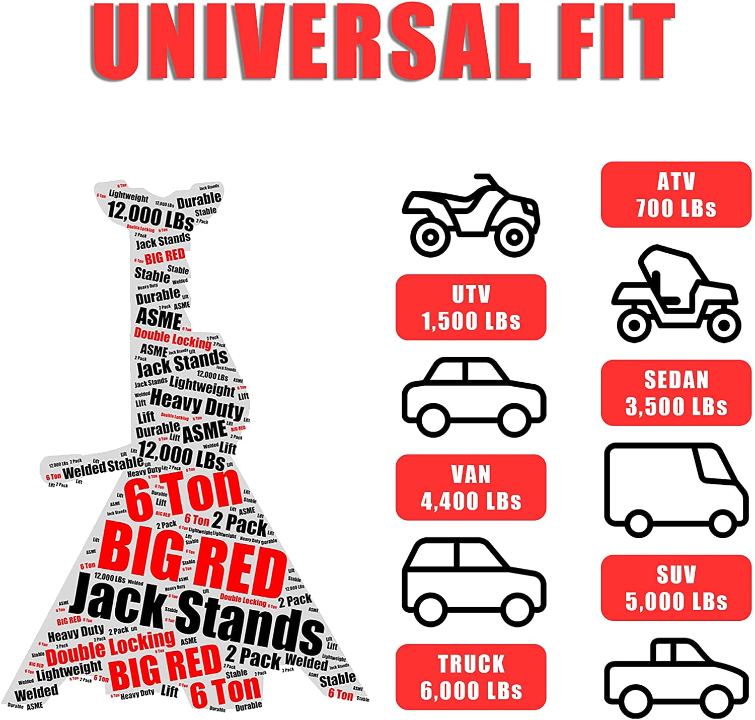 Torin BIG RED DT46002A double locking 1 pair steel jack stands are a must for you in any garage,the maximum load capacity is 6 ton,(12,000 pounds). Double locking jack stands help support vehicles after lifting with a jack; Handles a wide range of vehicles including small cars, jeeps, ATV’s, UTV’s, and more Features a lifting range of 15-3/8″ to 23-13/16″ with a 6 ton(12,000 )pounds maximum load capacity; Saddle has a large surface area that provides better contact with the load being supported Constructed with heavy-duty steel and is industrial welded for quality and long term durability; Removable locking support pin provides added security that increases safety by 200% Wide pyramid style foot base provides added strength; Large foot base delivers additional stability and measures 7-11/16″ x 6-7/8″ Multi-position forged iron ratchet bar has a sawtooth design, allowing for quick height adjustments that lock into place; Meets ASME safety standards and includes a limited 1-year manufacturer warranty