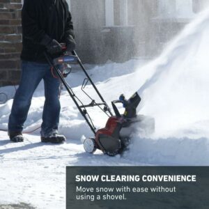 The Toro 1800 Power Curve 18 in. Electric Snow Blower is designed to move snow quickly and clean all the way down to patios, decks and driveways while helping to eliminate clogging. The snow blower’s zip deflector provides a choice between high, low and in-between snow throwing while its 160° chute helps you direct the snow discharge in many directions. This model features an ergonomically-designed handle for a comfortable grip during use.