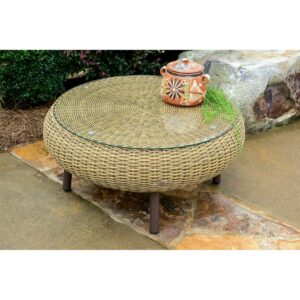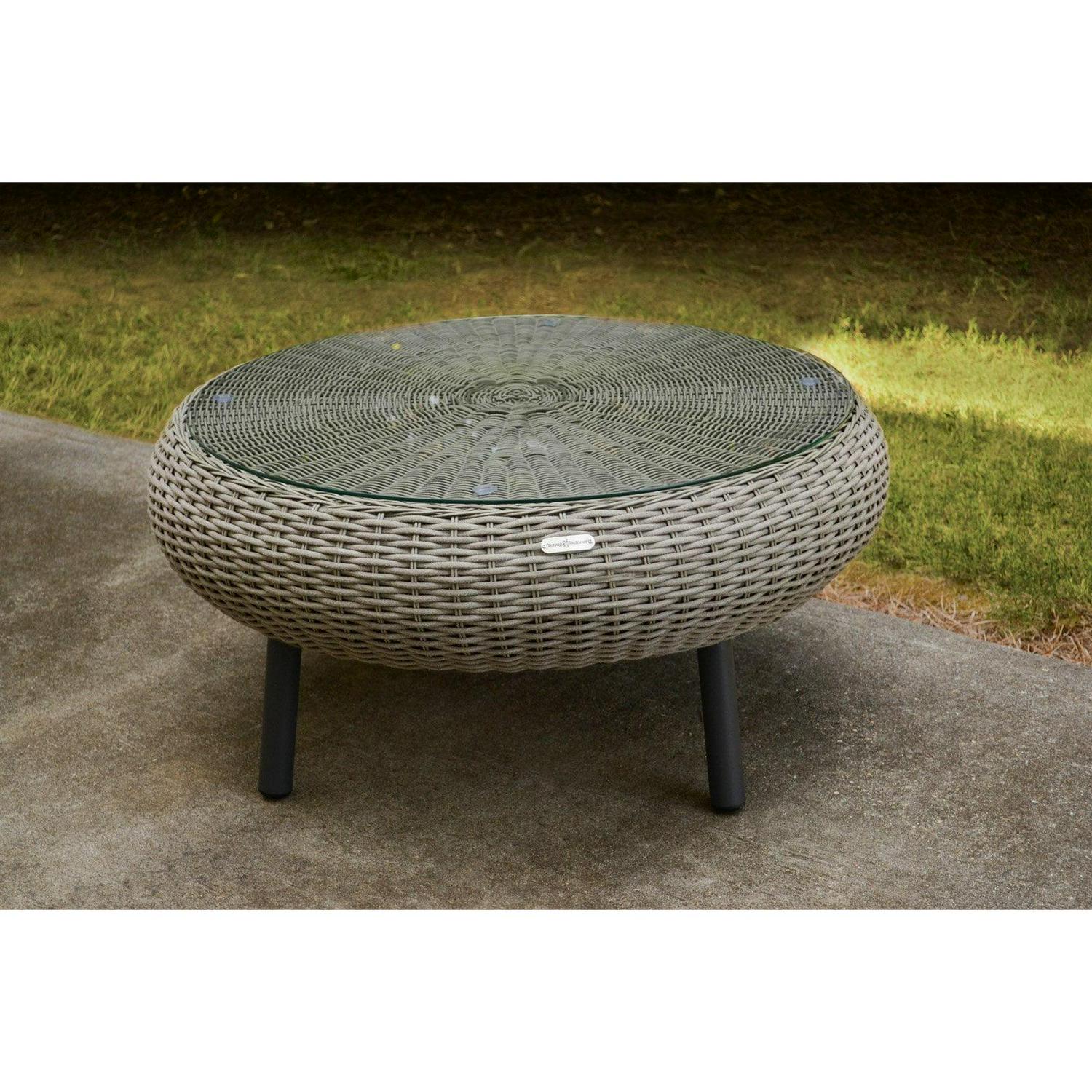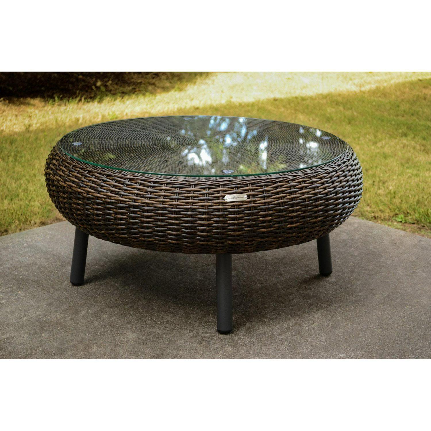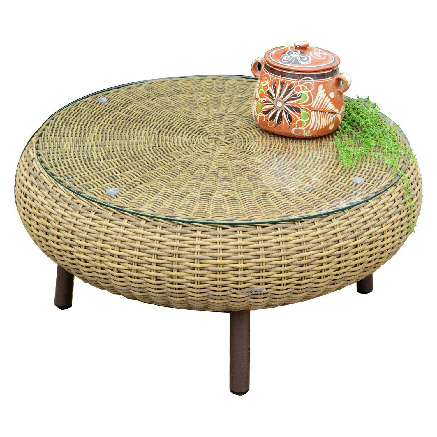 Complete your patio arrangement or just place the Tortuga Outdoor Round Wicker Table poolside to keep your drink and towel handy. This outdoor table is durably constructed of powder coated aluminum, and the round tabletop is covered with hand-woven resin wicker and topped with 6 millimeters of tempered glass. The glass stays in place with suction cups. Your choice of available finishes will help to coordinate it with existing outdoor furniture. For long-lasting use, the materials resist damage from UV rays and water. Some assembly is required, but not to worry, the hardware and tools are included!