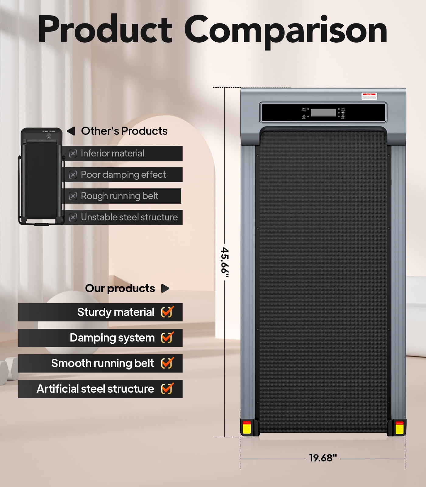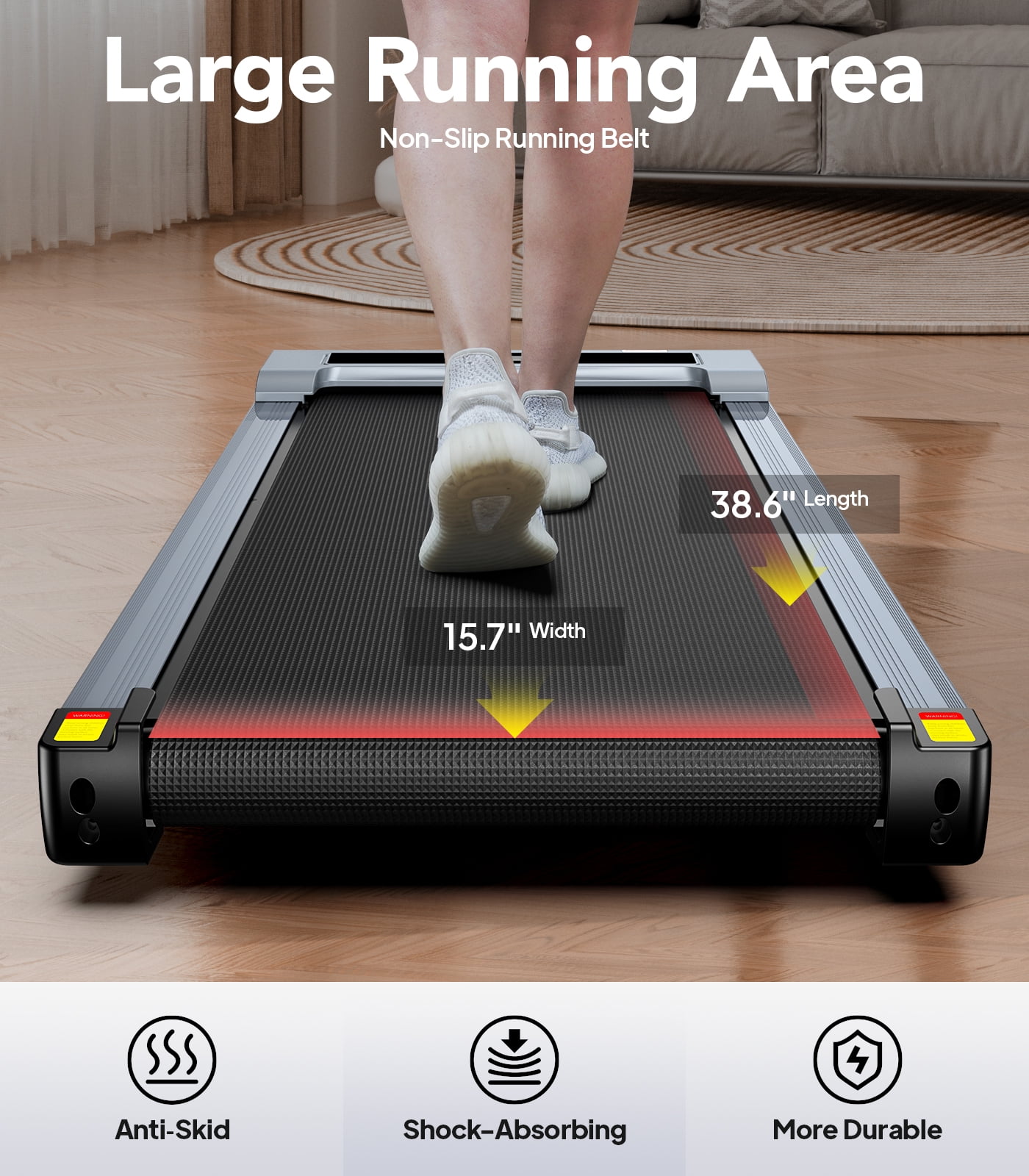Features: 0.5-3.8MPH 2 IN 1 Treadmill This 2 IN 1 walking pad is equipped with 2.5HP powerful motor with a running speed range from 0.5-3.8MPH.It can be used for walking, working or jogging.Meet the different need of your exercise or work mode,brings you a different sense of experience in your boring life. Anti-Slip Running Belt The walking treadmill is equipped with 5-layer anti-slip belt, providing 38.6″*15.7″ large running area for free movement. It can not only offer you with a comfortable experience,but also effectively reduce joint impact and protect your knees. LED Display Screen & Remote Control This under desk treadmill clearly displays and tracks data with an LED screen showing distance, speed, time, steps and calories. Plus, you can adjust the speed and control your workout with the remote control. Portable & Space-saving The underdesk treadmill is designed with a compact footprint that fits easily into any space, whether it’s under a sofa or under a table. With two transport wheels on the top, it can be effortlessly lifted and moved anywhere. Balance Your Life and Work Embrace a healthier lifestyle with this versatile, reliable treadmill that fits seamlessly into your daily routine, whether at home or in the office. You won’t worry your family or colleagues. Satisfied Service We provide professional and prompt after-sales service. If you have any questions and use of this treadmill, please contact us at the first time, we will answer you within 12 hours and provide you with reasonable solutions in a short time. Specification: Speed: 0.5-3.8 MPH Motor Power: 2.5HP Item Weight: 39.68 lbs Size: 45.66″ x 19.68″ x 5.11″ Running Area: 15.7″ x 38.6 Maximum Weight: 280 lbs LED Display: time, speed, distance, calories, and steps 1 year warranty parts Package including: 1�Treadmill 1�Remote Control(Battery Not Included) 1�Remote Control box 1�Silicon Oil 1�User manual 1�Shape Wrench