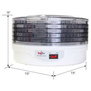 – 5 Large Capacity Ventilated Trays: Electric food dryer includes five 12-inch diameter dishwasher-safe trays for maximum yield without compromising quality or drying time