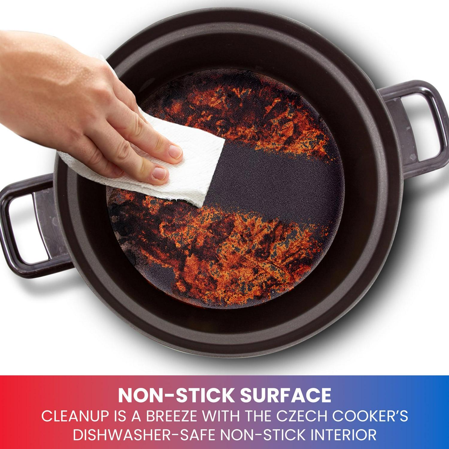 – NON-STICK SURFACE Cleanup is a breeze with the Czech Cooker s dishwasher-safe non-stick interior