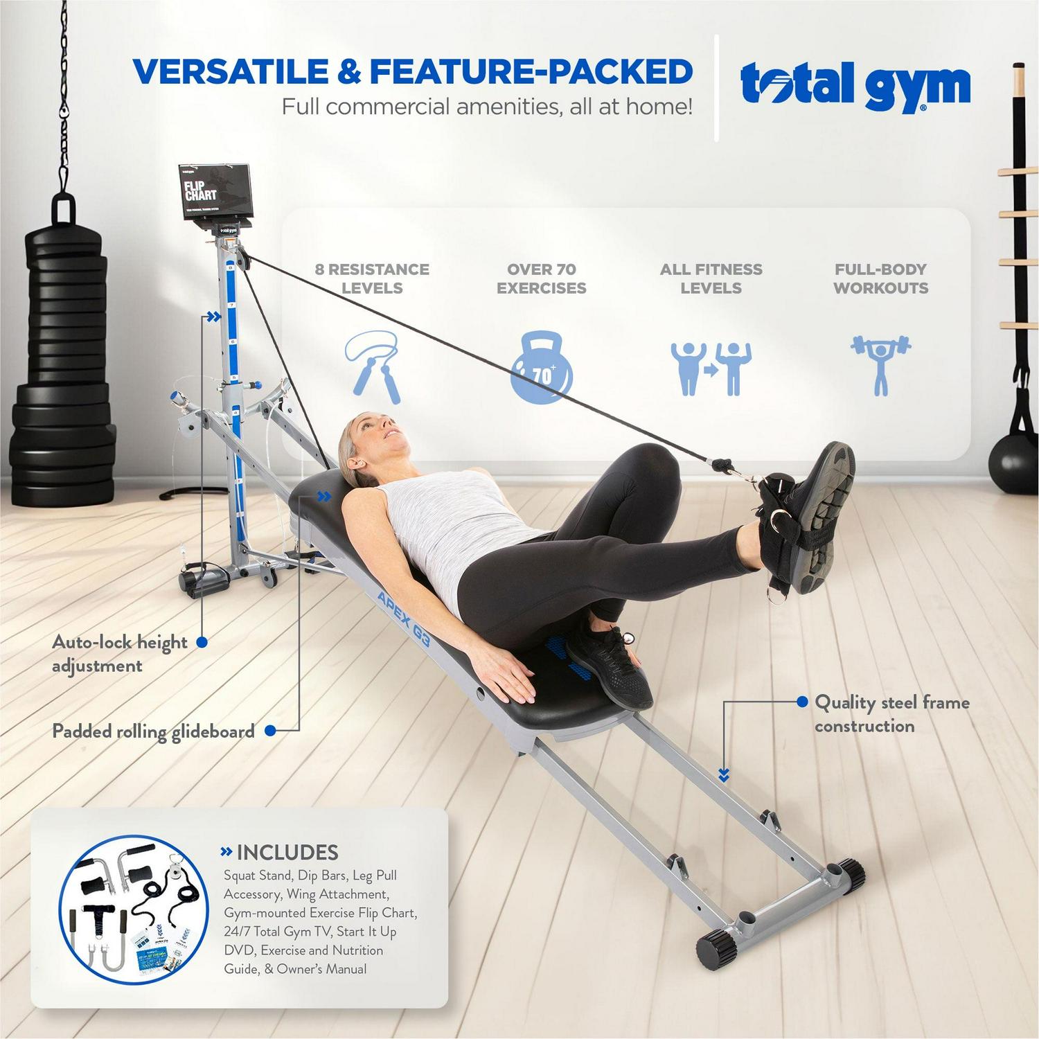 With the Total Gym APEX G3 home fitness equipment, you have everything you need from a commercial facility right in the comfort of your own home. This innovative, multi-purpose design delivers an unparalleled strength-cardio-stretching-infused, full-body workout for anyone at any age or fitness level. The APEX G3 features 8 levels of resistance and includes a cable pulley system, wing attachment, leg pull accessory, dip bars, and a squat stand for added upper and lower body exercises. Using the incline glide board and your own body weight as resistance, the APEX G3 is so versatile it allows for over 70 exercises and limitless workouts. Whether you re looking to burn calories, build muscle, or improve flexibility, the Total Gym APEX G3 accomplishes that and more, even folding up for easy storage. Receive guidance from Total Gym training programs (start off with the provided Start It Up DVD), exercise tools like the included flip chart, and the new Total Gym TV on-demand video platform to stream workouts from any device 24/7. All you need is 10-20 minutes a day, 3-5 days a week. Enhance your everyday workout and challenge yourself with the various resistance levels by using this home gym machine. Take your home workout to new levels with the Total Gym APEX G3 Home Fitness Trainer.