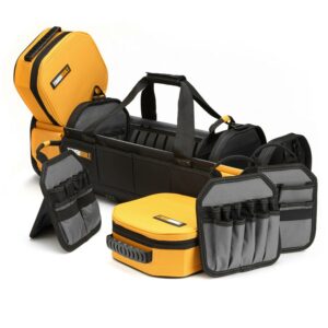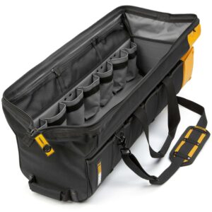 The ToughBuilt 30″ Massive Mouth transforms how professionals carry tools and supplies. The patent pending opening is wider than anything on the market for superior accessibility. Comes with padded shoulder strap, and side handles to carry the heaviest loads. The unique octagonal shape with rigid plastic HardBody lining protects everything inside and keeps its shape. Comes with a lockable zipper for security and safety. Its 65 versatile pockets and loops include a covered notebook pocket, structured external pockets that flex to securely hold tools in place, and durable zippered mesh pockets for visibility. Made with high-quality, rugged materials and heavy-duty rivet reinforcement, this hard-working bag keeps up with the professional’s rigorous demands.