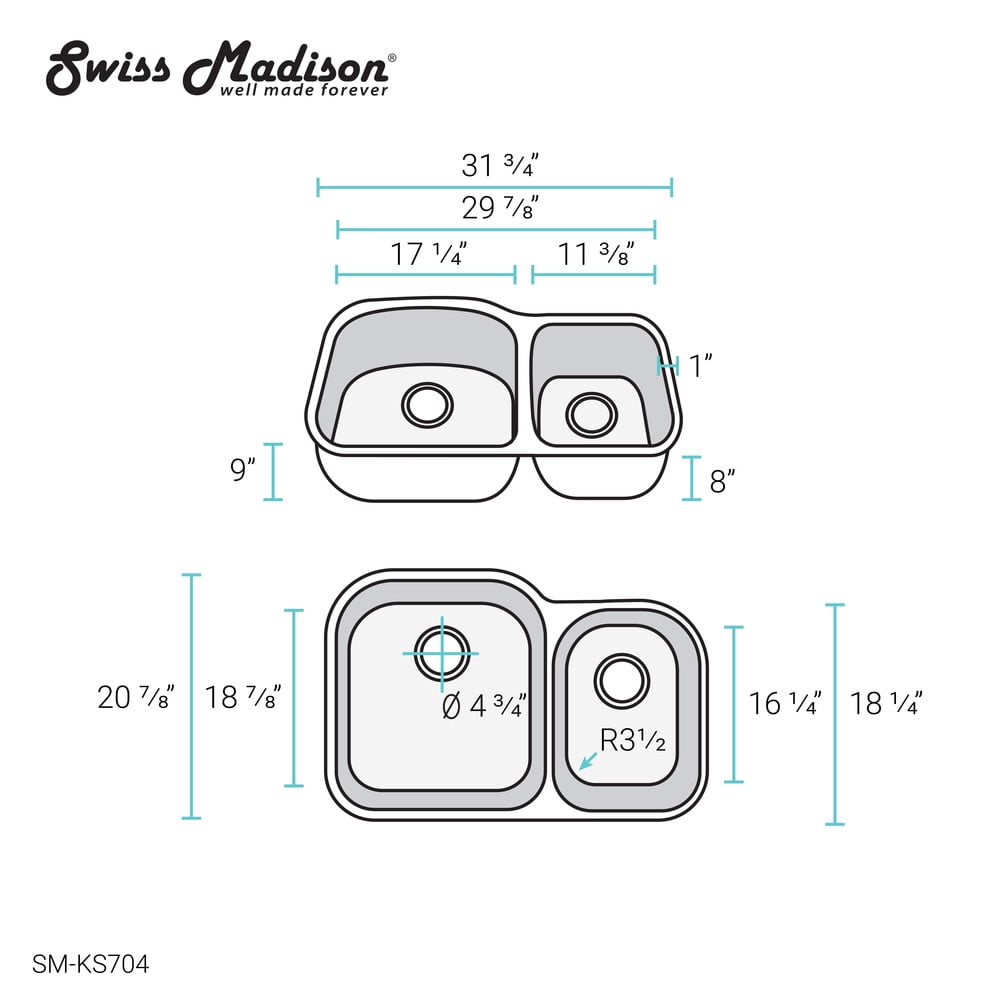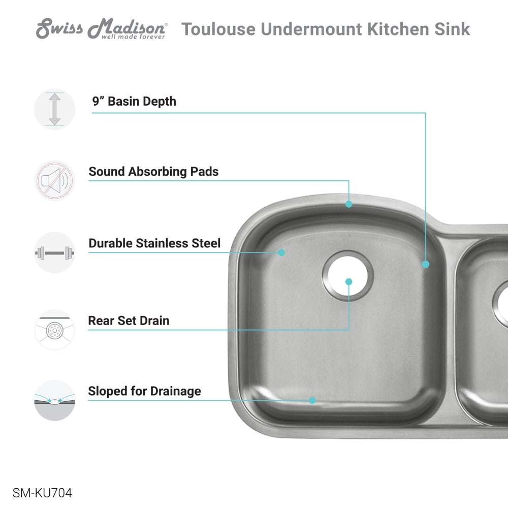 Undermount Installation: Designed to fit beneath the countertop and cabinetry to provide a seamless look. Material: Durable and long-lasting 18 gauge Stainless Steel. Drain Location: Rear Center Basin Depth: 9 Inches Dual Basin: Offers flexibility in space for food prep, washing, and various other activities. Rounded Corners: Designed with rounded corners for for ease of cleaning and maintenance. Sound Absorbing Pads: Equipped with sound-dampening pads to minimize sink noise and vibration. Sloped Drainage: The slightly sloped sink basin allows water to drain easier. Cabinet Size: The minimum interior of your cabinet should be 3″ wider than the width of your sink. Included: Mounting clips and cutout template. Collection: Part Of The Toulouse Collection, Explore Additional Products In This Collection To Complete The Room. Dimensions: 32″W X 21″D X 9″H One Year Limited Warranty
