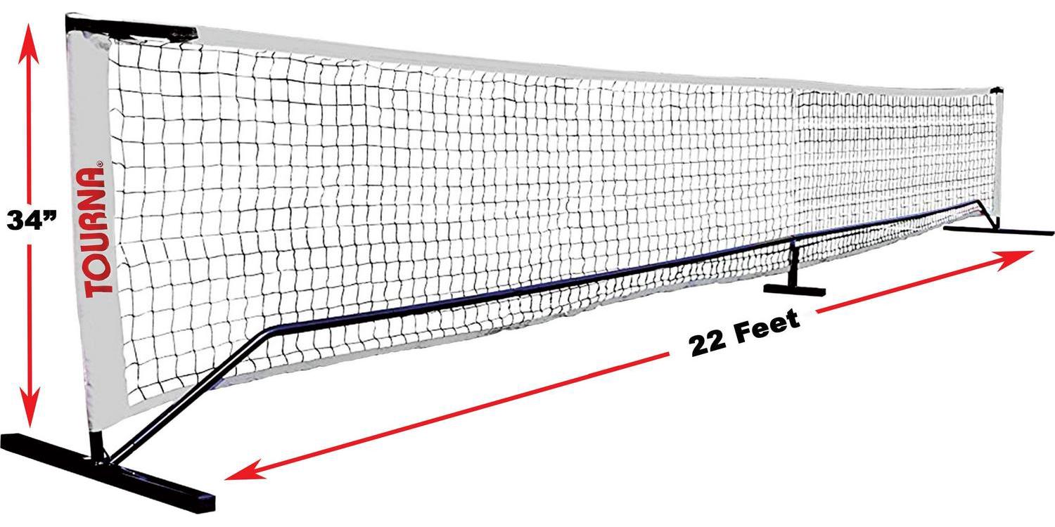 Tourna portable steel net system is made to official Pickle ball standards (34 inch h) x (22’w). adjustment straps on net edge for perfect net tension. Sturdy and stable – net features metal middle support with fiberglass net support and side tension adjustments. Fast and easy assembly, with nylon bag for carry and storage. Set up on a tennis court, on a Basketball court, or any flat surface.