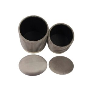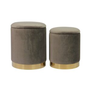 Perfect for small spaces the pleated round TOV Furniture Channeled Storage Ottomans – Set of 2 offers both, stunning design and ample storage space. Available in two neutral colors, it’s upholstered in soft velvet and complemented with a brushed gold base. Set includes two ottomans.