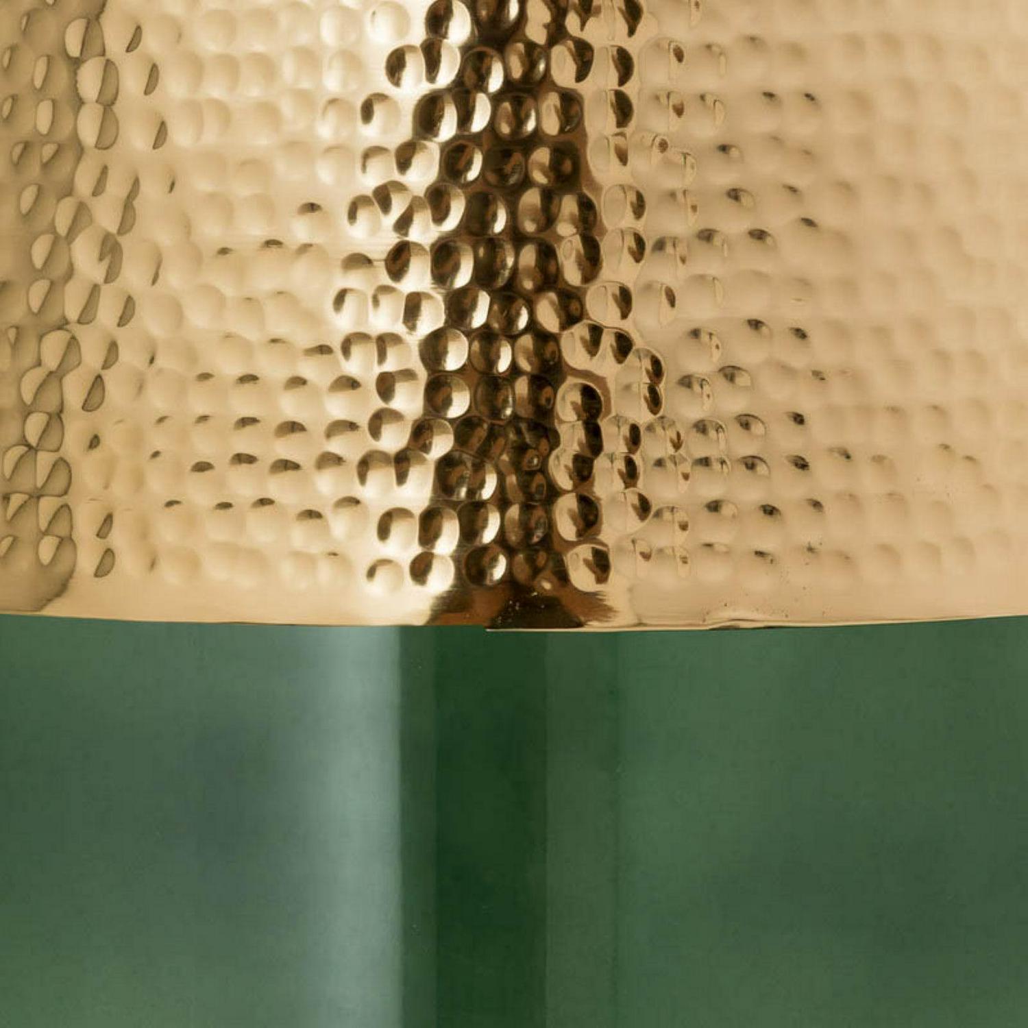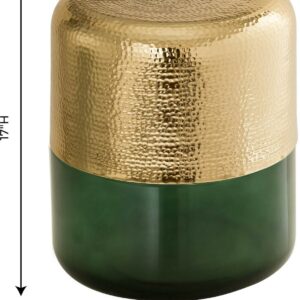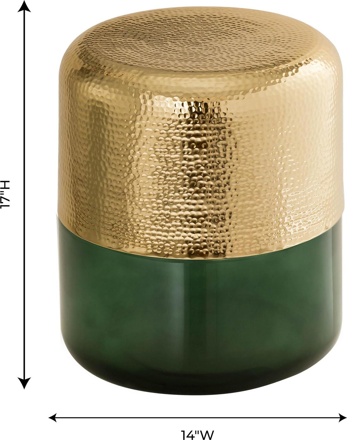 The TOV Furniture Kolla reen and Gold Drum Side Table’s intriguing looks are created by hand hammering the aluminum top to create its distinctive dimpled texture. The translucent glass base comes in your choice of select color options. Together, they bring glam looks to any living room or bedroom.