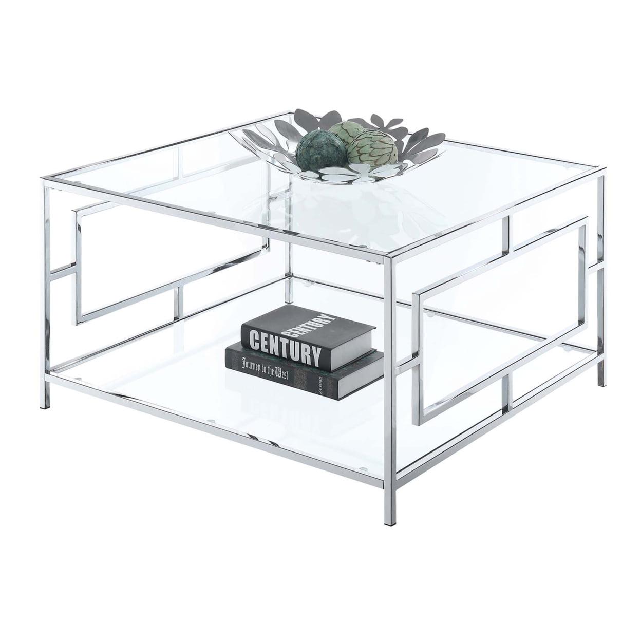 Town Square Chrome Square Coffee Table Able to open up your living space, the Town Square Chrome Square Coffee Table by Convenience Concepts is the perfect addition to your ensemble. Both its tabletop and bottom shelf are ample enough for all your living room essentials as well as your favorite collectibles. It is crafted from a chromed metal frame with signature geometric side designs and tempered clear glass inserts. The frame is sturdy and the shelves are easy maintenance, making your life a little easier. This glass unit will add visual space to any room in your home. Place in your home study or den and witness its endless versatility. Its chic contemporary style will update your current decor. Enjoy its quick and simple 4 step assembly today! Complete the look with additional items from the Town Square Collection by Convenience Concepts. Each sold separately.
