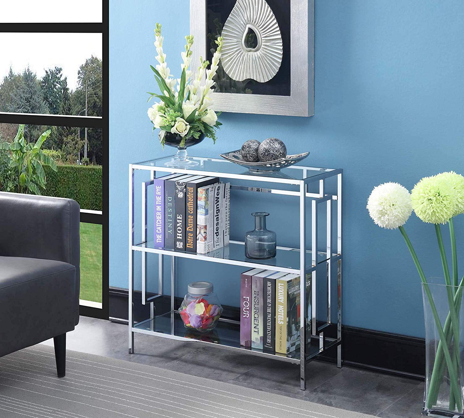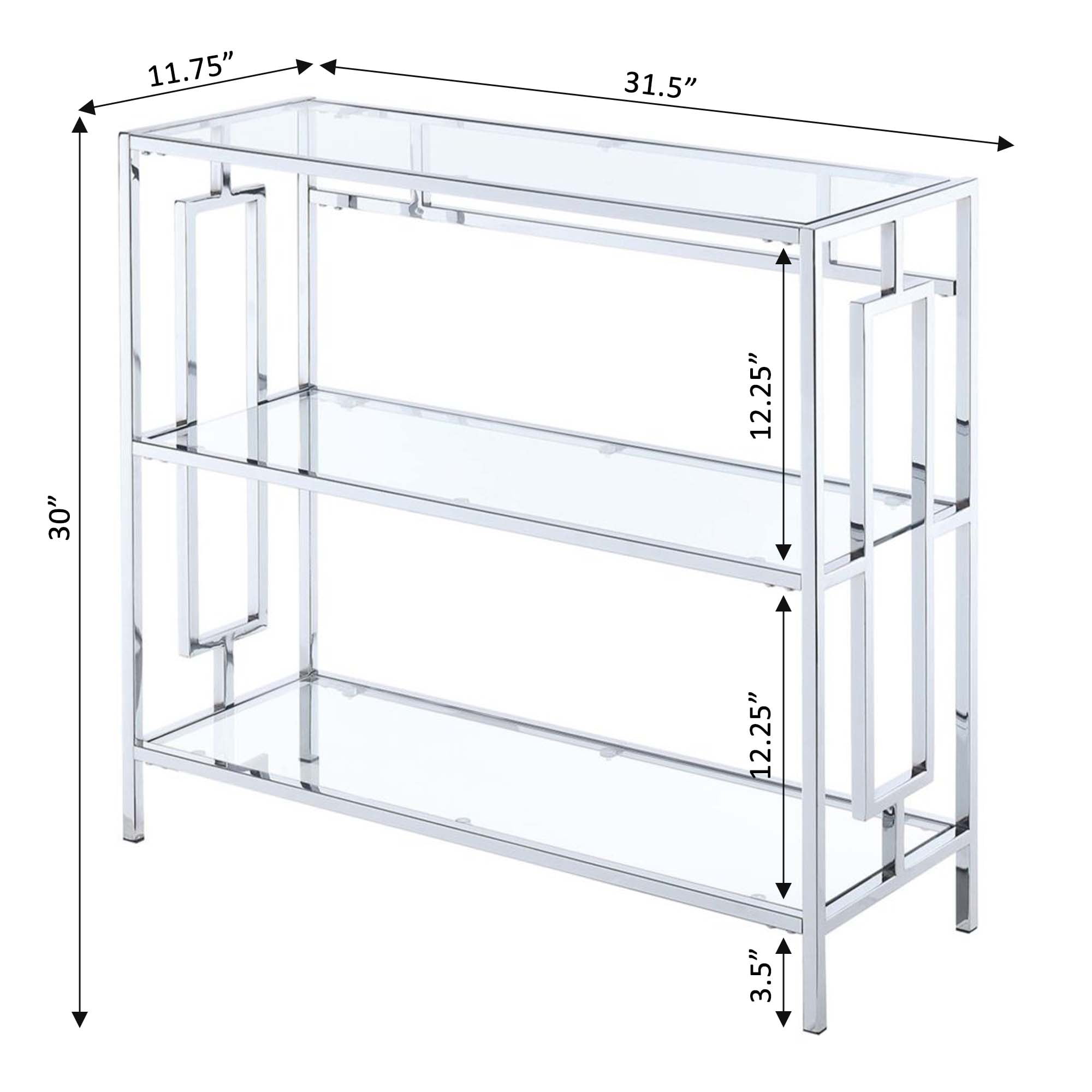 Stylish glam design ISTA3 certified Made from tempered clear glass and chrome metal Made in China Assembly required 31.5 in. W x 12 in. D x 30 in. H (35 lbs.) Tired of boring bookcases? The Town Square Chrome 3 Tier Bookshelf is the perfect solution. Brimming with glam design, this 3-tier display is ideal to incorporate your favorite books into your decor. with style. Books no longer must be stored away from sight. Show them off with pride with this sleek open concept piece. this chic bookcase provides enough space for your favorite trilogies or favorite collectibles. Look for more furniture pieces from the Tucson Collection by Convenience Concepts.