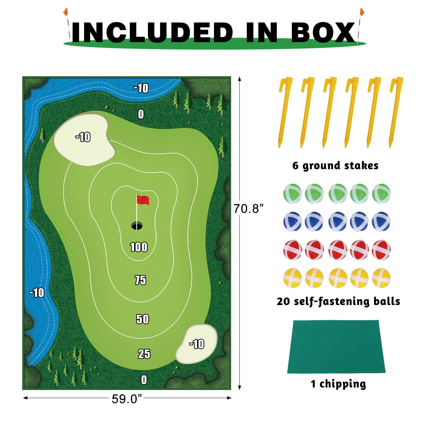 ⛳ Chipping Mat & Sticky Balls: The chipping golf mat set is a great indoor and outdoor golf game for the whole family, suitable for beginners and skilled players to practice golf. This fun golf set includes a large mat (about 6 ft long and 5 ft wide), 20 sticky balls, 6 ground stakes, and one chipping mat. (golf clubs not included) ⛳ Perfect for Party & Family Game: Go for the Win! Enjoy your competitive fun, each player take turn to aim for their chips, strike to the marked scoring area to get the most points and wins. The mat is brightly colored with a center goal and obstacles. Shoot for the center for the most points. Just beware of the sand traps and water .. Those are negative points. ⛳ Golf Game & Toss Game: The golf mat can be used not only as a golf game scene, or an indoor and outdoor game, but also as a toss game toy hanging on the wall at your convenience; It’s easy for compact storage, and portable even for kids to unroll for set up; ⛳ Premium Quality: Made of durable fabrics and sticky, the chip golf mat, with fine-lined woven construction and washable material, present a realistic putting green for player. Mat can be used in the backyard or inside the house. Balls are solid enough to shoot but soft enough to not cause damage to walls or indoor fixtures.