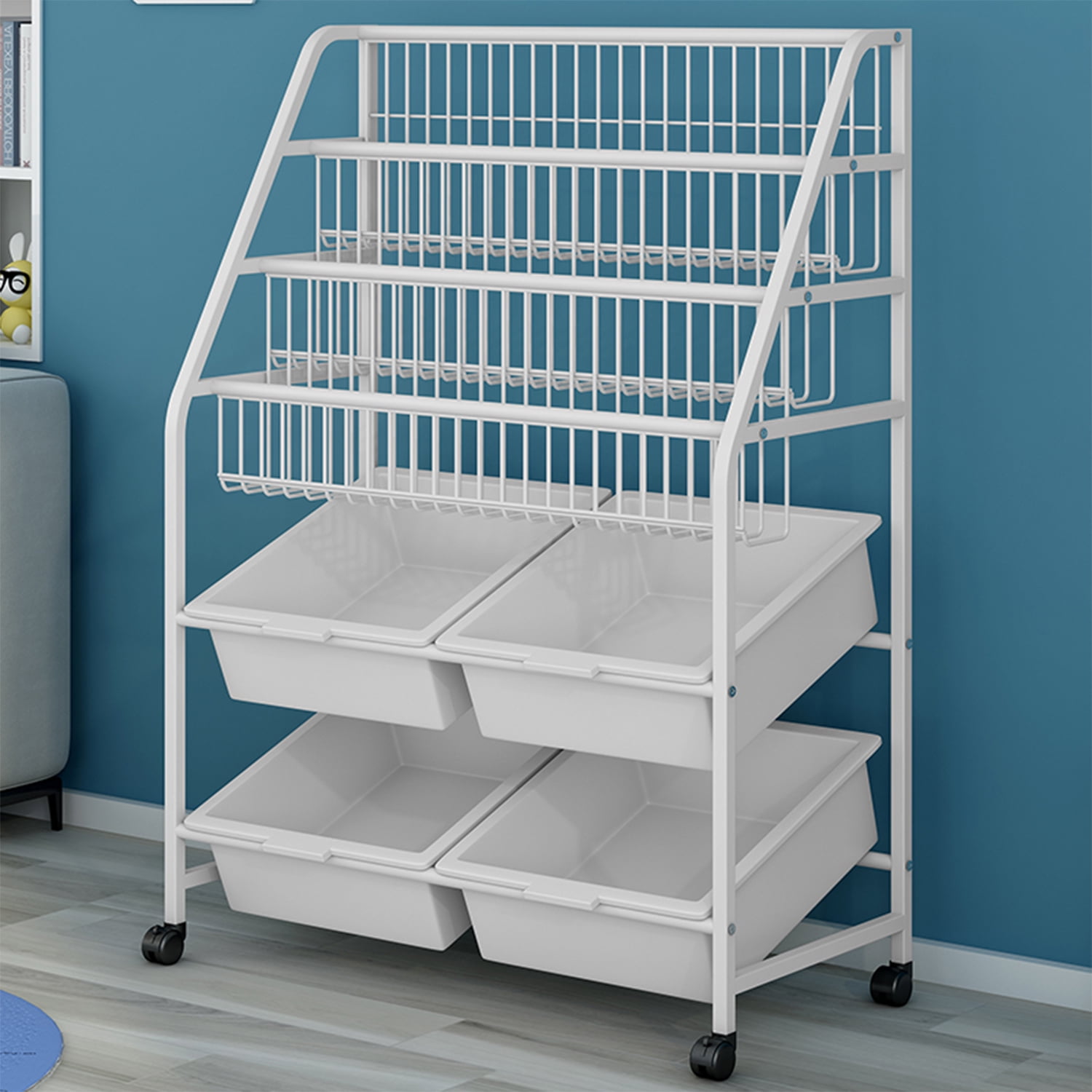 2 in 1 Kids Bookshelf: There are 4 storage bins at the bottom, which can be used for children to store their favorite toys, stationery, art accessories, etc. 3-tier shelves with large space on the top can hold children’s books, and keep your children’s room well-organized. Practical storage rack: The bottom of the rack is equipped with 360 degree rotating rollers with brakes for easy movement. It can be placed in bedroom, study, kitchen, children’s room, living room or office. Space-Saving and Easy Installation: Our cute bookshelf helps you improve your kids organizing ability. Taking up minimalist floor area, but also can provide enough storage space for your children. Every bookshelf is equipped with the installation instructions and tools, it is easy and quick to assemble. Strong and Durable: The bookshelf is made of metal and the storage bins are made of high-quality PP material. Don’t worry about its sturdiness, it is not easy to be deformed or damaged. Perfect Size: The size of our kids book rack is 100cm×60cm×30cm/39.3″L x 23.6″W X 11.8″H, the perfect size is suitable for the children, they can easily identify and pick up their books. It is good rack for cultivating children’s reading interest.