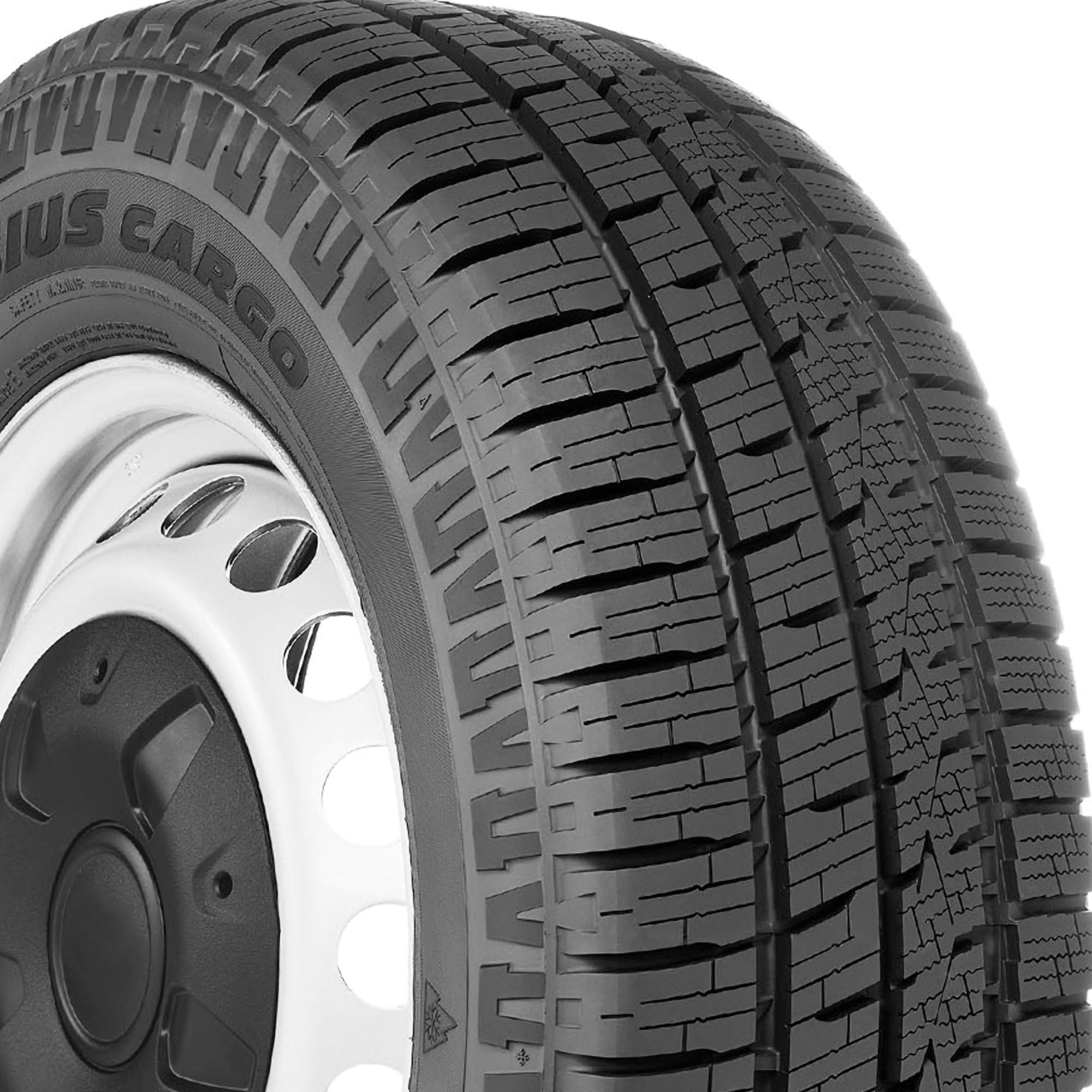 An all-weather tread design maximizes wet and dry traction with a circumferential rib and low void ratio on the outside tread Zigzag shaped tread blocks that contain high sipe density on the inside tread optimize ice, slush, and snow traction Snow claws grip the snow and ice to improve traction Slush grooves evacuate snow and ice to maximize traction Multi-wave sipes minimize irregular wear for a smooth ride while also improving tread life Offers drivers improved braking on icy, wet, and dry roads Three Peak Mountain Snowflake qualified for severe snow conditions Used on popular commercial vans such as the Ford Transit, Chevrolet Express, Ram ProMaster, Mercedes-Benz Sprinter, and Nissan NV Size: LT275/65R20 Load Range: E Product May Vary From Picture Wheel/Rim Not Included