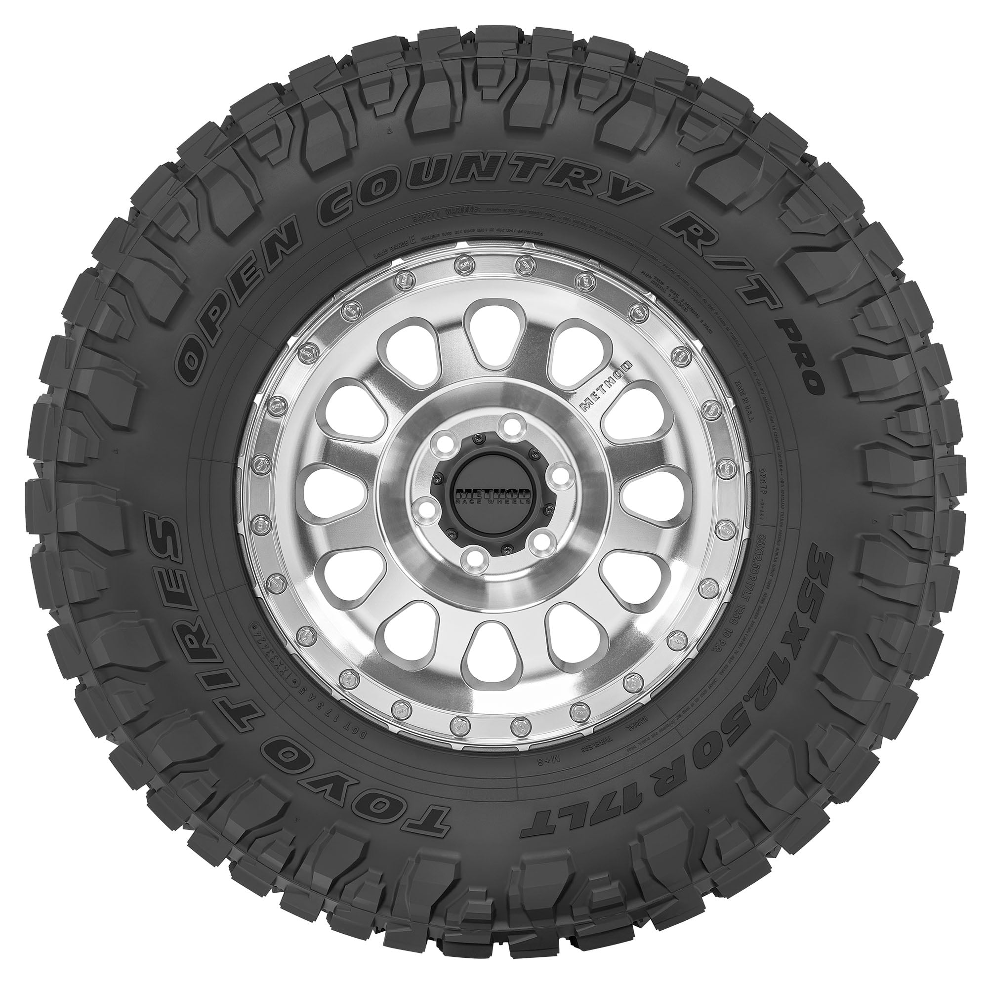 Toyo Open Country R/T Pro LT265/70R17 123/120Q E OVERVIEW The Toyo Open Country R/T Pro is a rugged terrain tire designed for light trucks, Jeeps, and SUVs. With aggressive tread design and advanced compound technology, it excels in handling tough terrains like mud, gravel, and rocky trails while maintaining a quiet and comfortable ride on paved roads. Its reinforced construction enhances durability and resists cuts, chips, and punctures. In addition, Toyo’s proprietary tread pattern ensures excellent grip and traction in varying weather conditions, and its staggered shoulder blocks and optimized void ratio improve stability and handling.