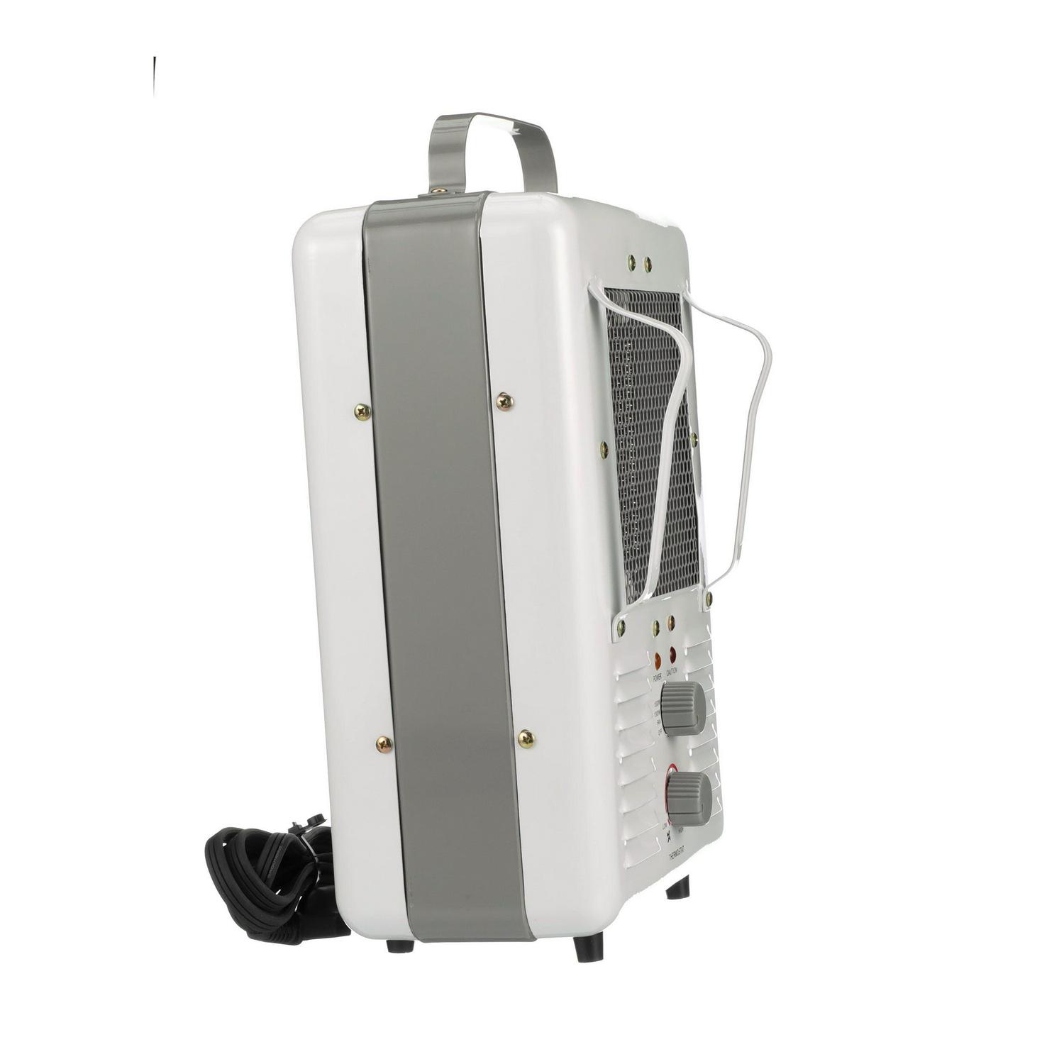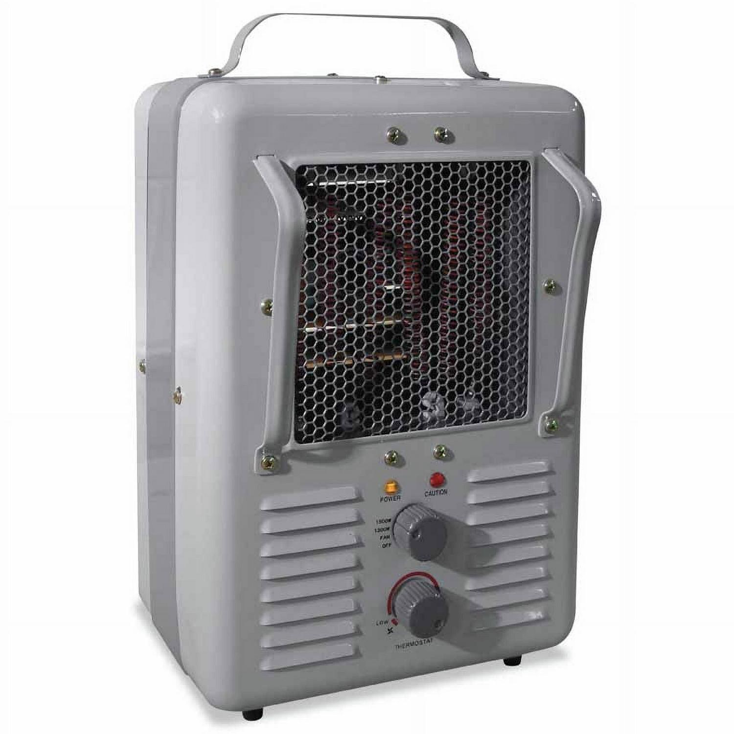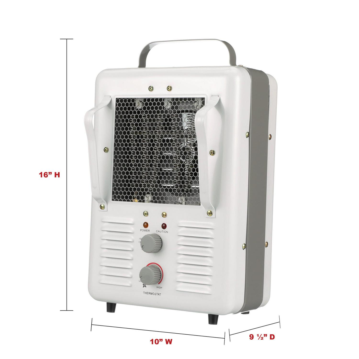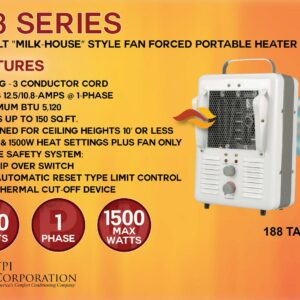 Create a comfortable environment for work or relaxation with the TPI Fan-Forced Milkhouse Style Heater. It has a lightweight, compact and portable design with a top carrying handle for easy lifting and transport as needed. The TPI fan-forced heater features two heat settings: 1,300 watts and 1,500 watts. You can use it to circulate air, as a drier or as a heater. It features a tip-over switch and a thermal cut-off device for added safety and a temperature control thermostat for personalized comfort.