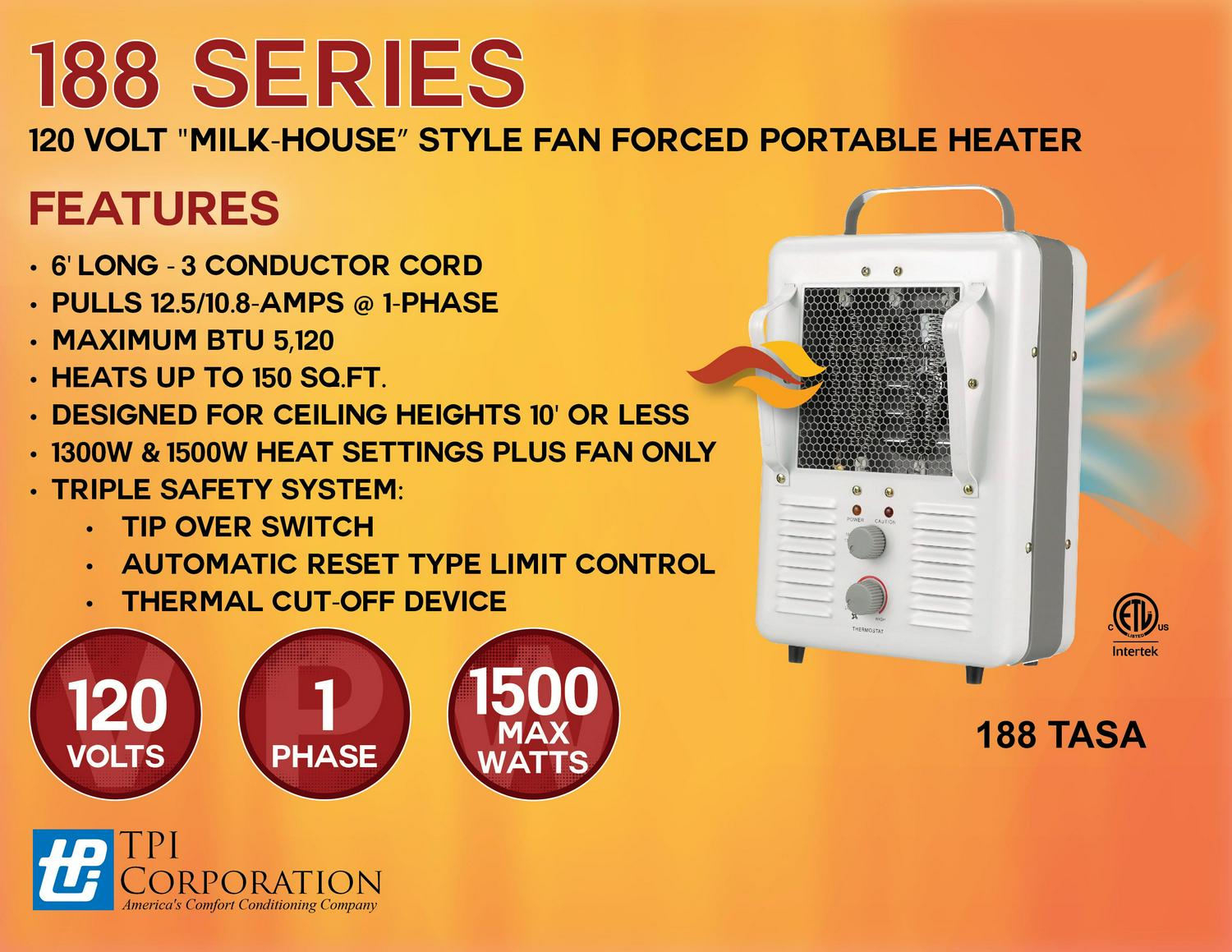 TPI Corp. 120V 1Ph Milkhouse Styleheater Fan Forced