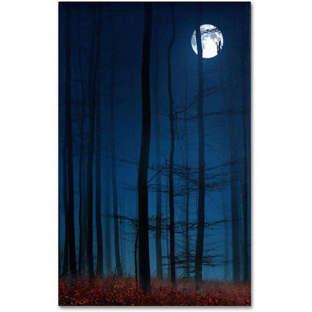 This ready-to-hang, gallery wrapped art piece features a hazy, moonlit forest in autumn.