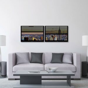 This ready to hang, gallery-wrapped multi panel canvas art set features a window overlooking New York City.