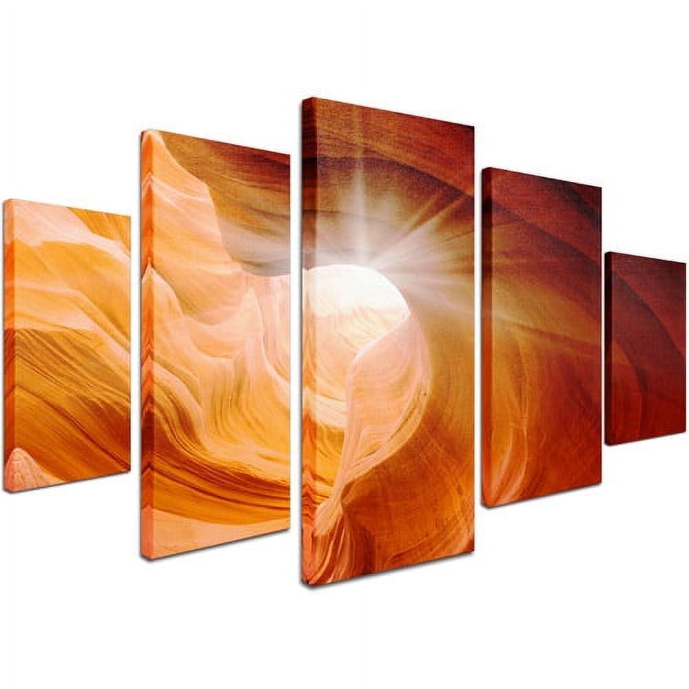 Give the room a modern look with this Trademark fine art canvas by Moises Levy. The piece features the walls of a rock canyon in five separate panels. Each piece is gallery wrapped so the canvas wraps around the sides and hides the wooden frame. The result is a contemporary look with one image continuously spread across several pieces. The gallery wrapped canvas art Smooth II is printed using giclee. This is an advanced print making process that results in high-quality reproductions that are almost indistinguishable from the originals. The quality is so high that it is even accepted by many art galleries and museums. Put this ready-to-hang canvas art 5-piece panel set, 58″ x 40″, in your living room to create a unique focal point that is sure to get attention. It also allows for a frameless presentation of the finished painting.